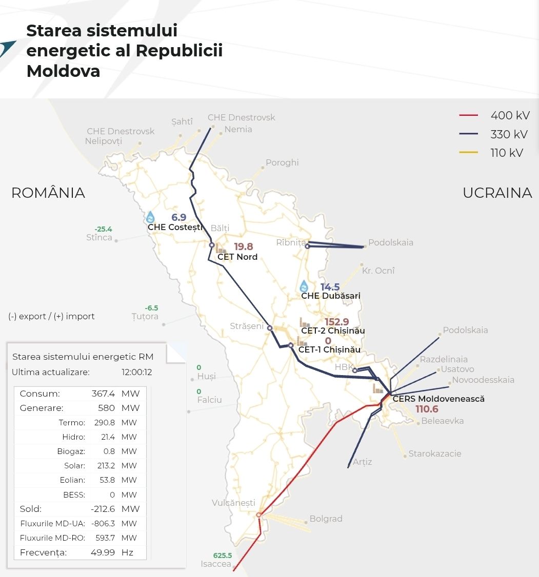 Ministerul Energiei precizează că la această oră, regenerabilele au depășit generarea la centralele termoelectrice şi au generat de aproape trei ori mai multă energie decât Centrala electrică moldoveneasca, MGRES.