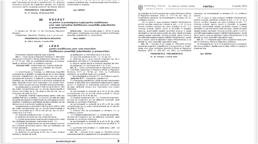 Președinta Republicii Moldova, Maia Sandu, a promulgat joi seara legea care modifică procedura de desemnare a membrilor în comisiile de evaluare externă a judecătorilor și procurorilor.