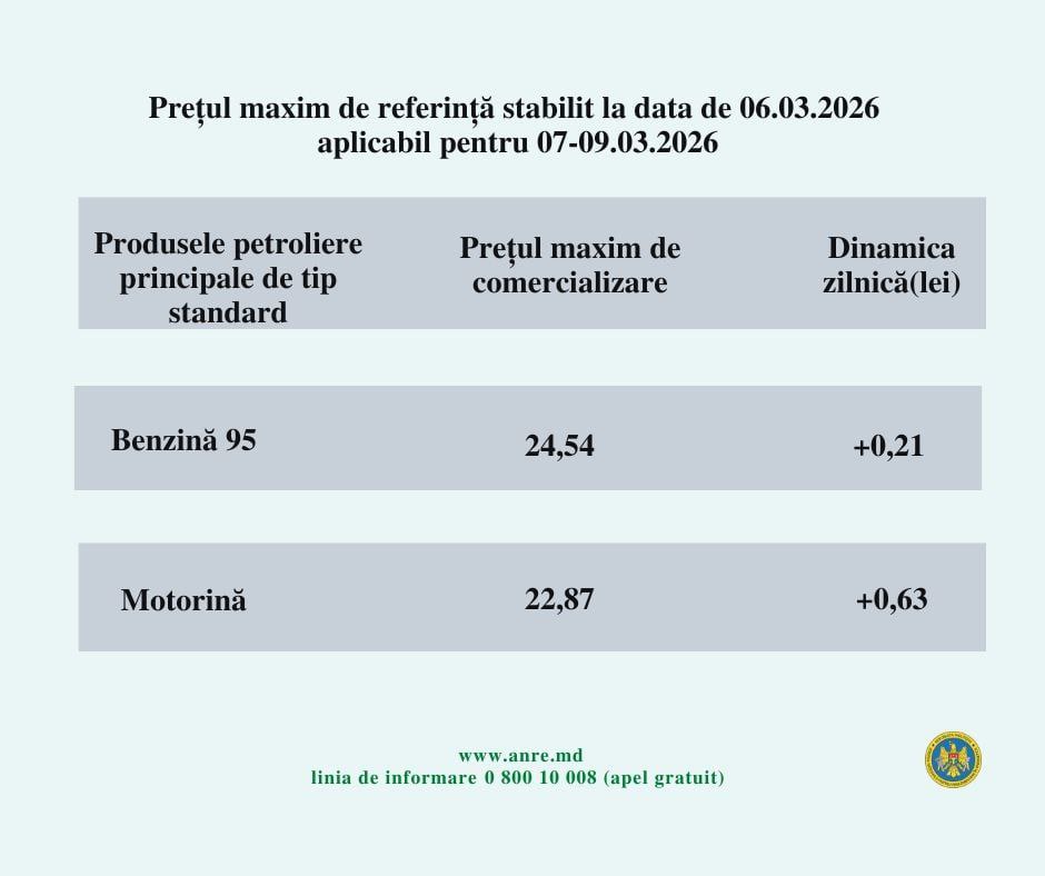 Prețurile la carburanți continuă să crească accelerat în Republica Moldova, iar cea mai dură lovitură o primește din nou motorina. Agenția Națională pentru Reglementare în Energetică (ANRE) a stabilit pentru perioada 7–9 martie un preț maxim de 22,87 lei pentru un litru de motorină, cu 63 de bani mai mult decât ziua precedentă. În același timp, benzina A95 va costa 24,54 lei pe litru, cu 21 de bani mai scumpă.