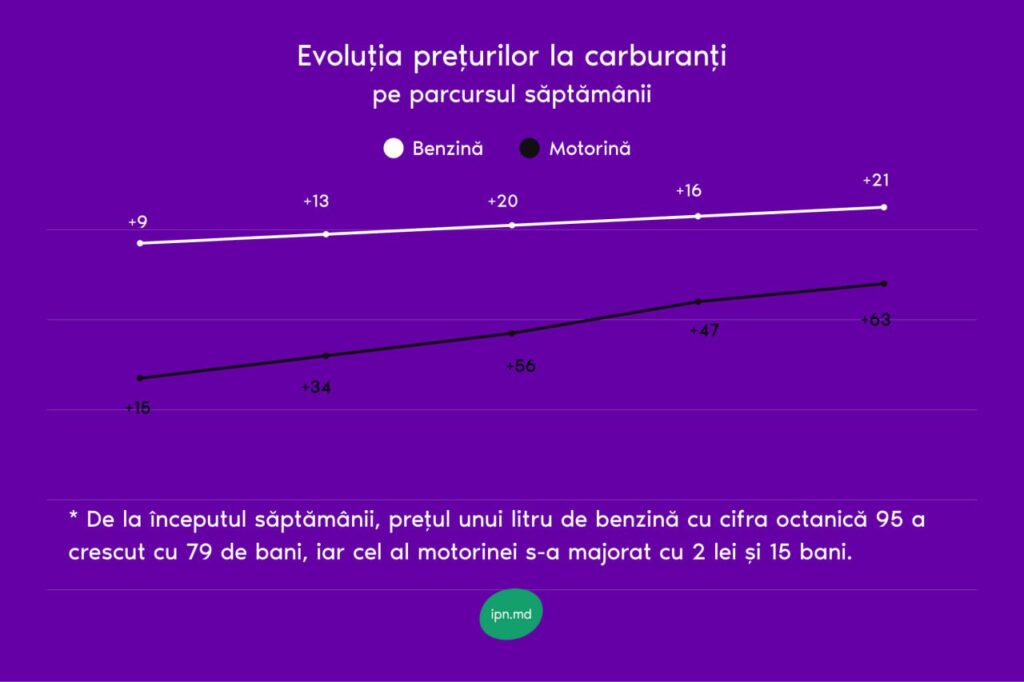 Motorina standard se scumpește în weekend cu 63 de bani, iar benzina cu cifra octanică 95 cu 21 de bani. De la începutul săptămânii, prețul motorinei s-a majorat cu mai bine de doi lei pentru un litru, iar al benzinei – cu circa 80 de bani, transmite IPN.