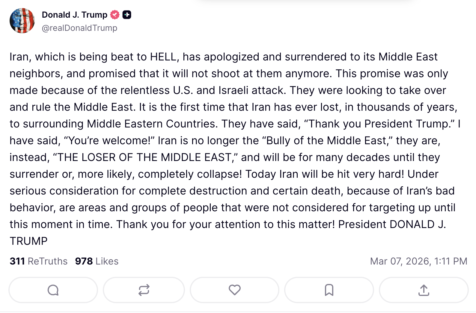 „Iranul, care este bătut măr, și-a cerut scuze și s-a predat vecinilor săi din Orientul Mijlociu, promițând că nu va mai trage asupra lor. Această promisiune a fost făcută doar din cauza atacului neîncetat al SUA și Israelului.