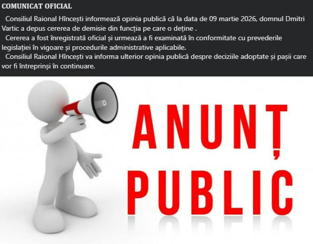 „Consiliul Raional Hîncești informează opinia publică că, la data de 09 martie 2026, domnul Dmitri Vartic a depus cererea de demisie din funcția pe care o deține”, se arată în mesajul publicat de consiliul.