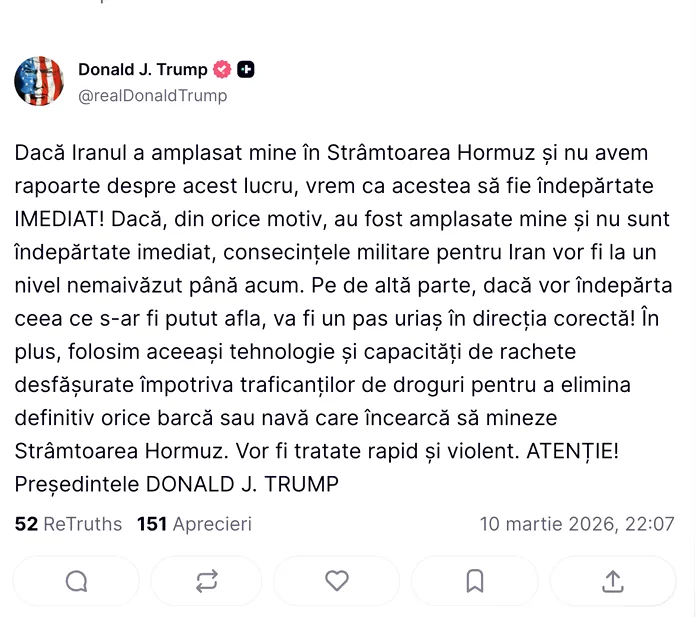 „Dacă Iranul a amplasat mine în Strâmtoarea Ormuz și nu avem rapoarte despre acest lucru, dorim ca acestea să fie îndepărtate IMEDIAT! Dacă, din orice motiv, au fost amplasate mine și acestea nu sunt îndepărtate imediat, consecințele militare pentru Iran vor fi la un nivel nemaivăzut până acum. Dacă, pe de altă parte, vor îndepărta ceea ce s-ar fi putut amplasa, va fi un pas uriaș în direcția corectă!”, a scris Trump pe Truth Social.