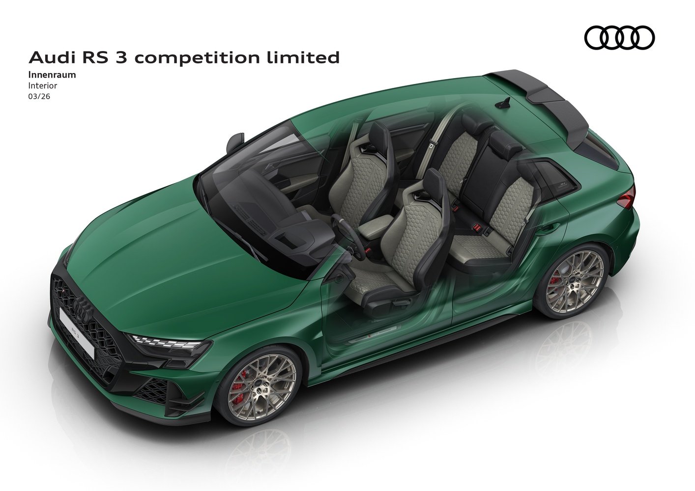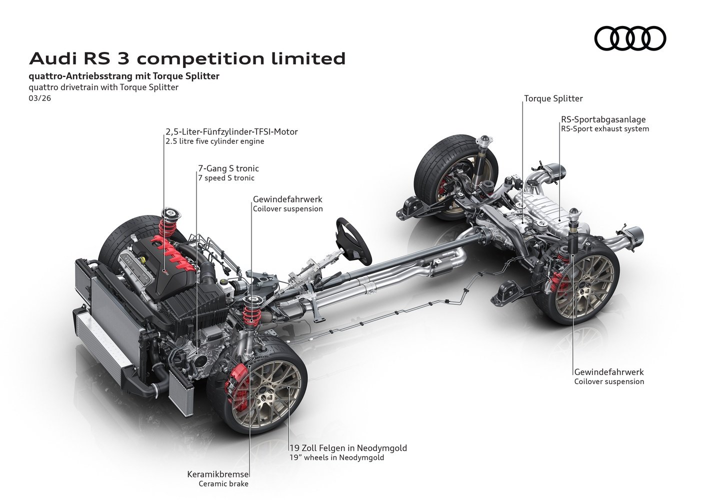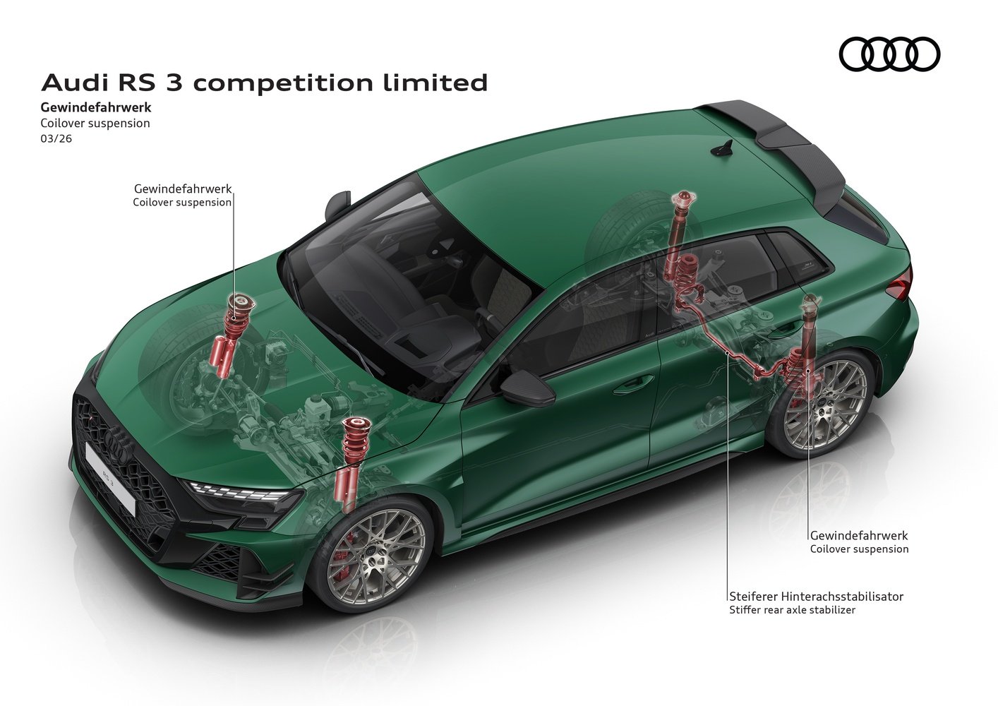 • Suspensie inovatoare: Pentru prima dată pe un Audi RS 3, este disponibilă o suspensie cu arcuri coilover (reglabilă), dezvoltată special pentru această ediție limitată.
