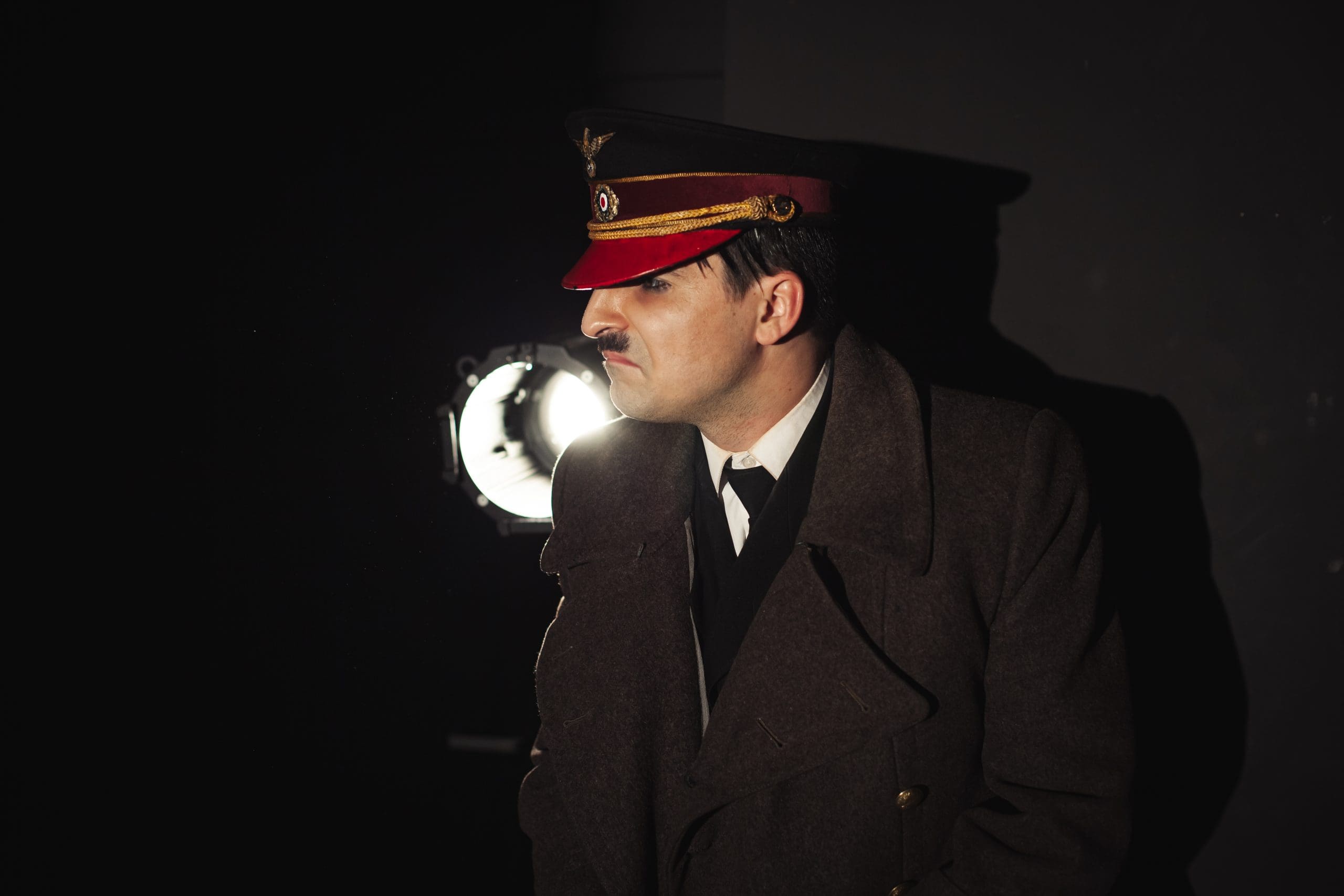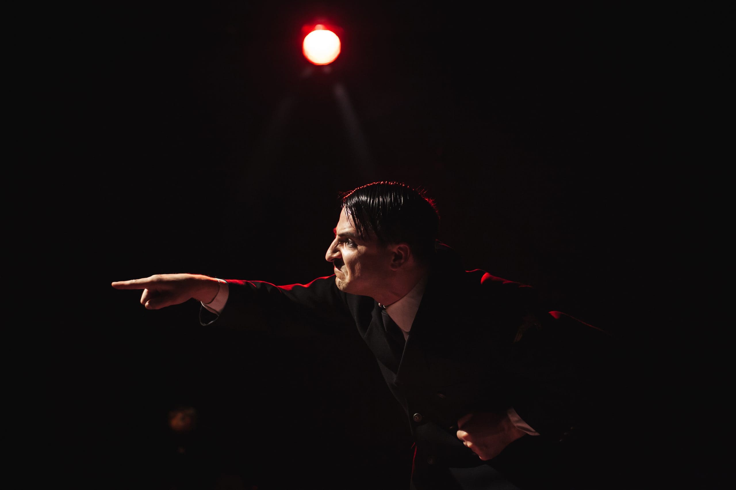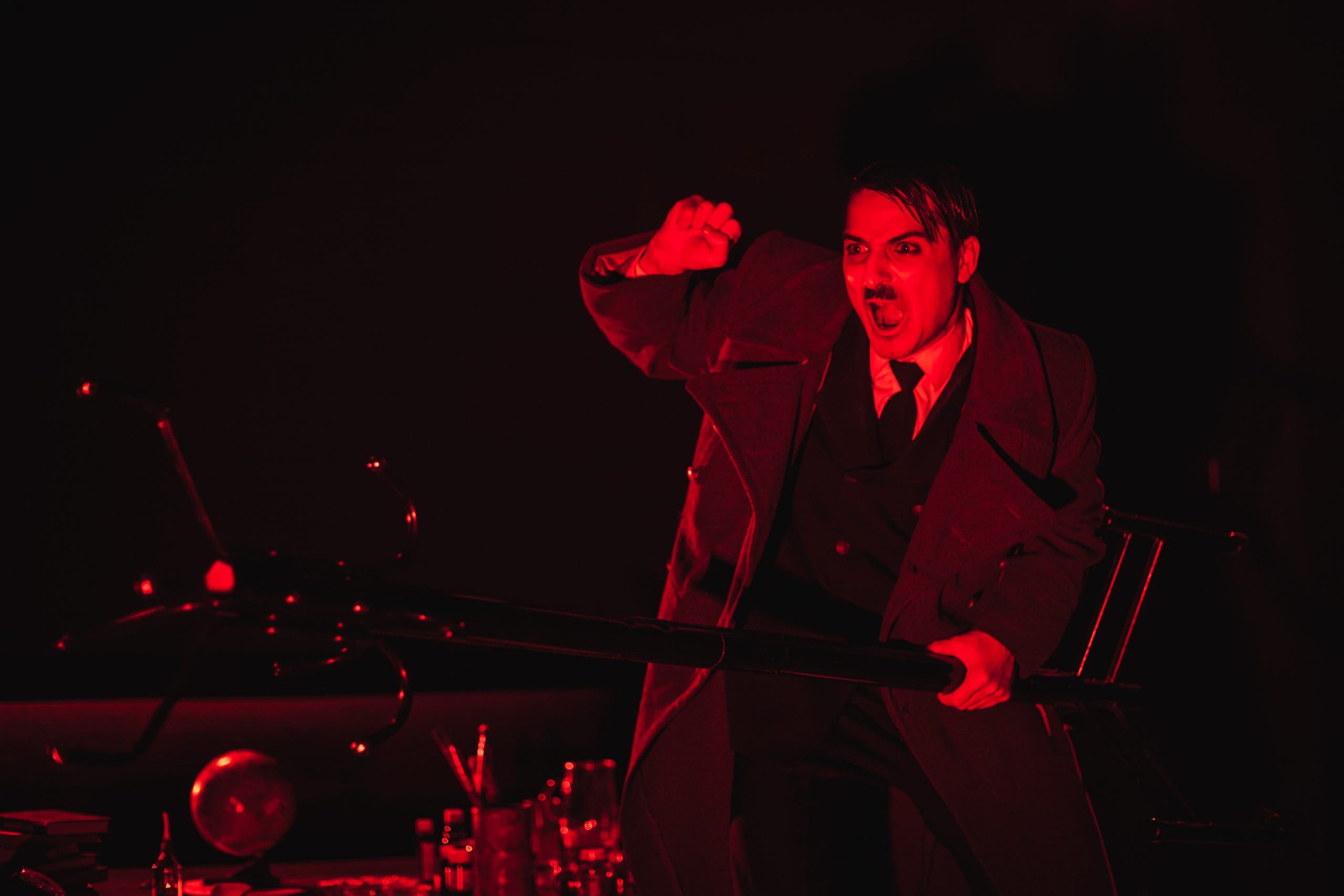 „Adolf Hitler” conduce Germania între 1933 – 1945. Un șir de factori, evenimente și idei îi creează personalitatea, transformându-se în figura care a declanşat al Doilea Război Mondial și a înfăptuit exterminarea etniilor în masă. În ultimele zile de război, retras în buncărul personal, își joacă actul final în totală intimitate. Obsedat încă de „complexul oedipian”, care i-a întunecat copilăria, poartă un dialog cu mama lui, unica fiinţă care a avut încredere în steaua lui și care îl alinta Adi. Fără nici o remușcare sau căință, nu realizează dezastrul pe care îl trăiește, nu-l sperie apropierea înfrângerii Germaniei sau apropierea propriului sfârşit, ci continuă să fie fascinat de propriul destin.”