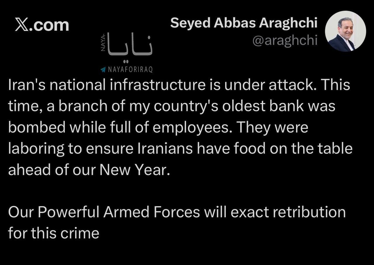 „Infrastructura națională iraniană este atacată. De această dată, o filială a celei mai vechi bănci din țară a fost bombardată, în timp ce era plină cu angajați. Aceștia lucrau pentru a se asigura că iranienii au mâncare pe masă înainte de Anul Nou.