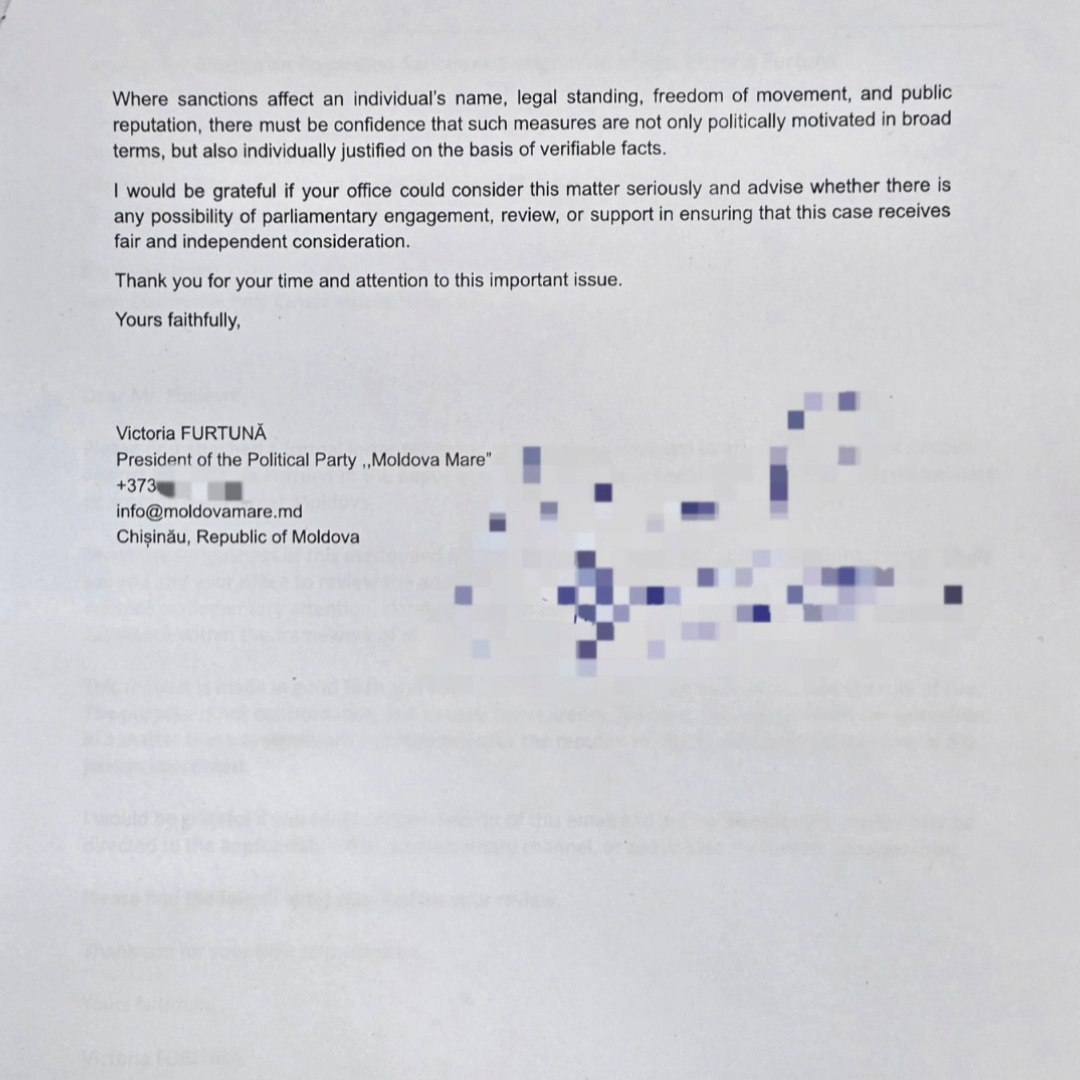 În document, Furtună solicită sprijin pentru clarificarea temeiurilor juridice și factuale care au stat la baza includerii sale pe lista de sancțiuni și cere o analiză a cazului din perspectiva corectitudinii procedurale și a transparenței.