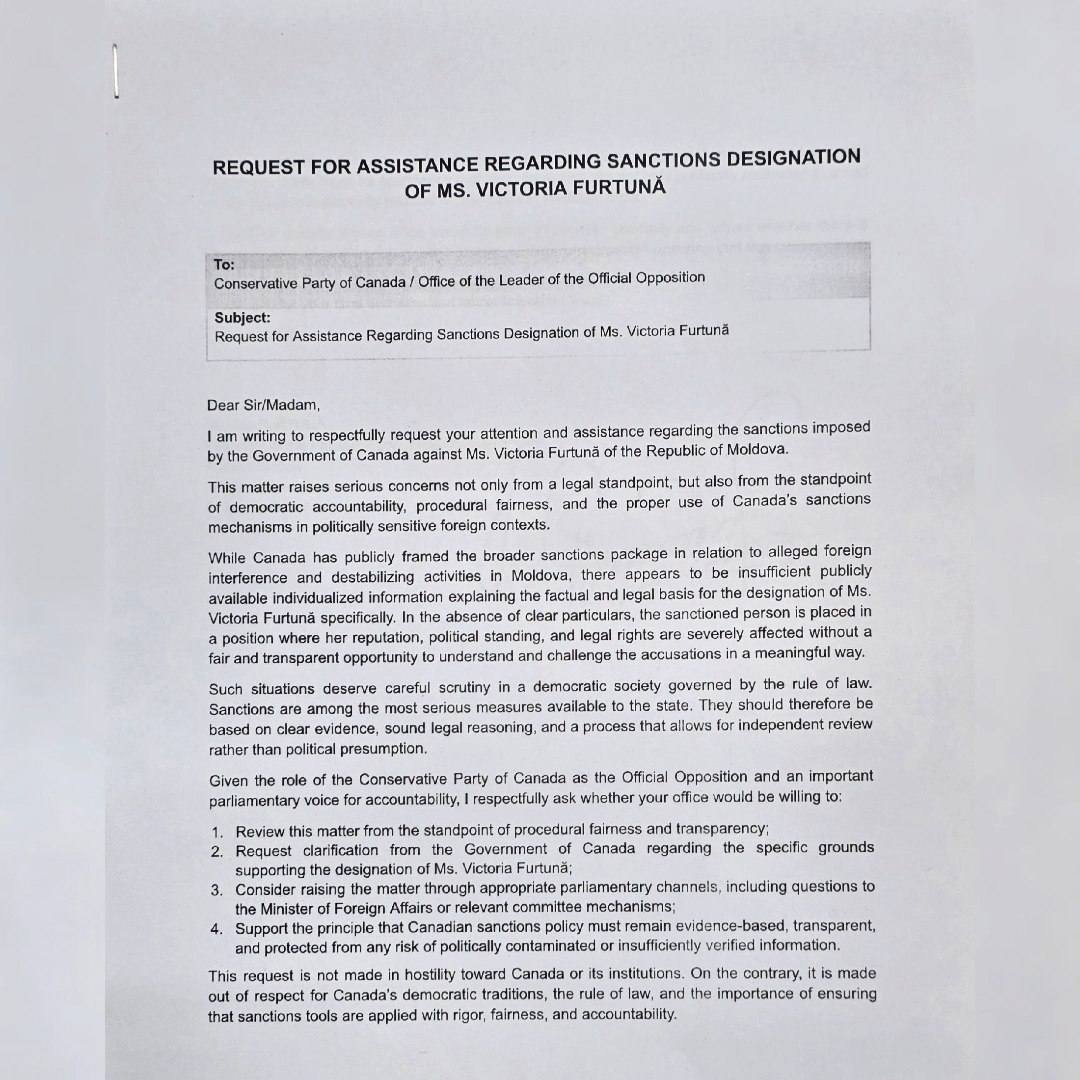 Victoria Furtună, președintele Partidului „Moldova Mare” și fost procuror anticorupție, a anunțat că a transmis o solicitare către Partidul Conservator din Canada și Oficiul liderului opoziției oficiale, prin care cere examinarea sancțiunilor impuse împotriva sa de autoritățile canadiene.
