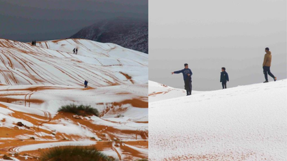O ninsoare rară a transformat dunele de nisip ale Saharei din nord-vestul Algeriei într-un peisaj alb, după ce temperaturile din orașul deșertic Ain Sefra au coborât sub punctul de îngheț. Un strat subțire de zăpadă a acoperit celebrele dune portocalii, creând un contrast neobișnuit între pătura albă și nisipul roșu-portocaliu, scrie antena3.ro.