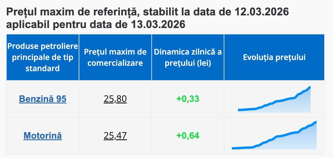 Amintim că, ANRE a explicat că scumpirile sunt determinate de evoluțiile de pe piețele internaționale, în contextul conflictului din regiunea Golfului Persic. De la începutul confruntărilor, cotațiile Platts pentru produsele petroliere au crescut cu 161 de dolari pe tonă la benzină (circa 23%) și cu 377 de dolari pe tonă la motorină (aproximativ 50%).