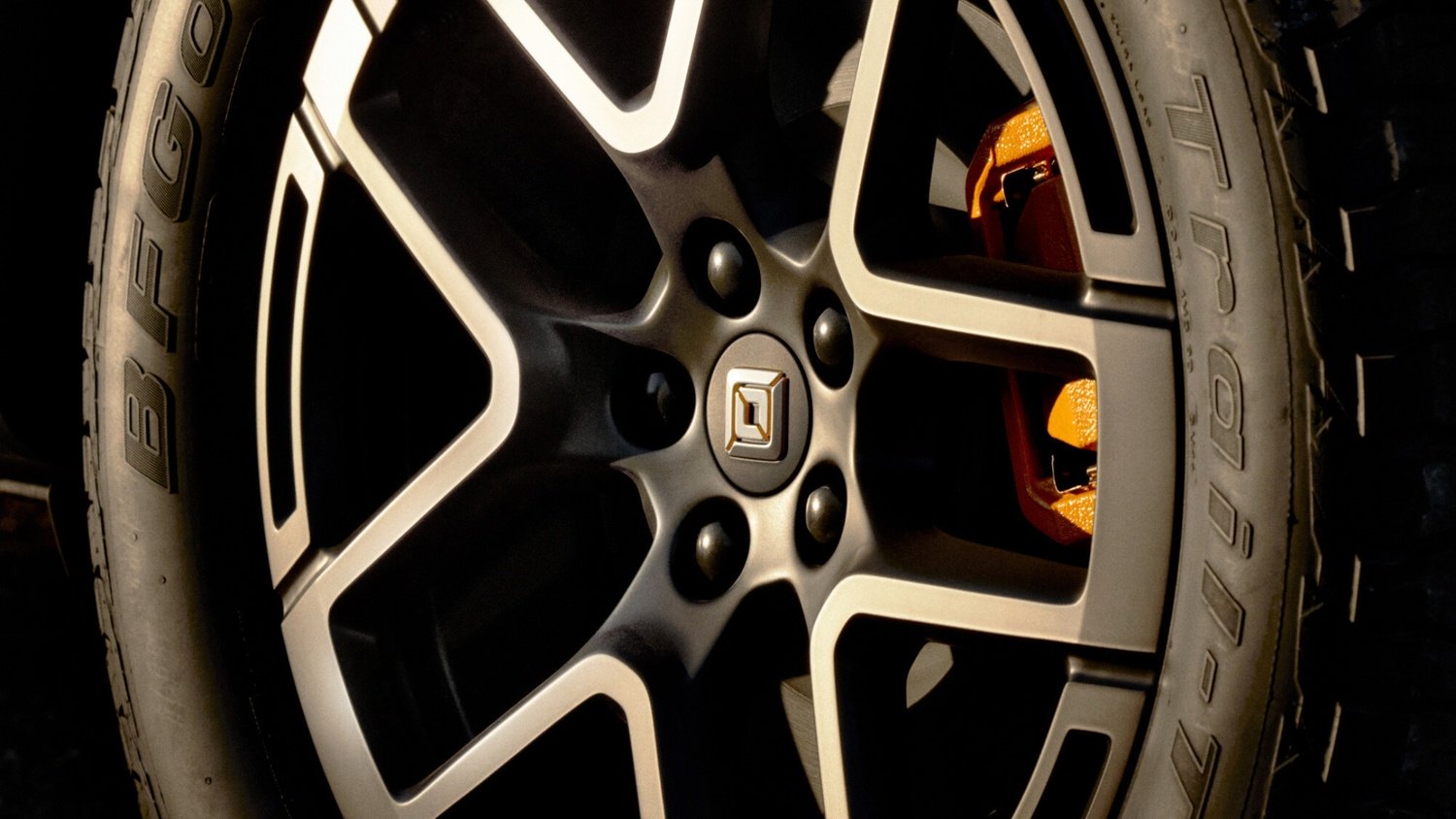 - 20″ Black Sand All-Terrain: Jante forjate cu finisaj închis la culoare, cu anvelope BF Goodrich all-terrain.