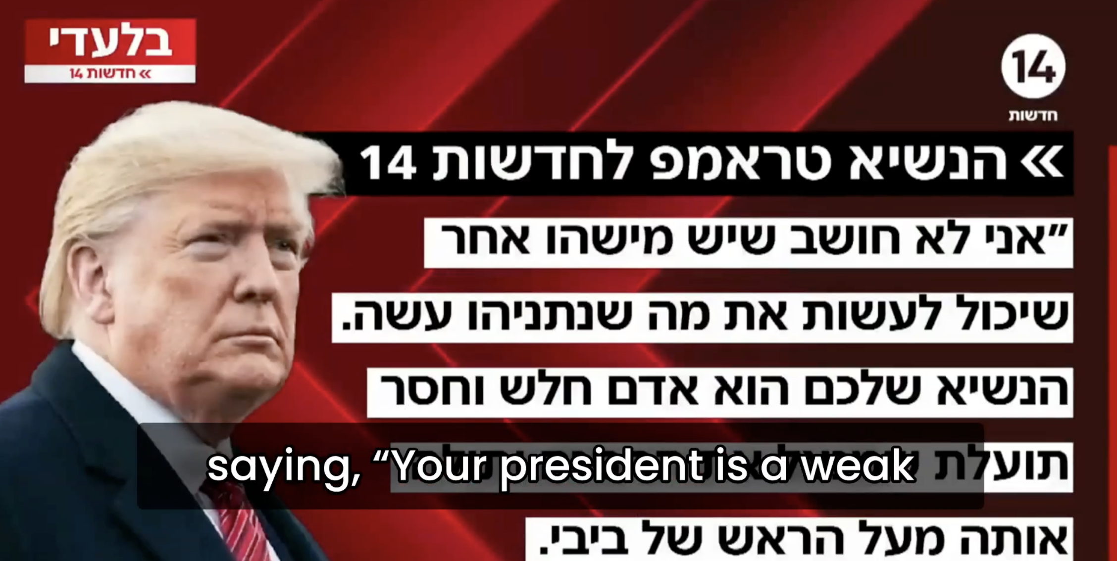 „Președintele vostru este un om slab. Președintele Israelului este un om slab și ineficient, care folosește grațierea și o flutură deasupra capului lui Bibi. Nici măcar nu ați mai avea Israelul în acest moment dacă el nu ar fi fost prim-ministru. Eu îl susțin pe Bibi”, a spus Trump.