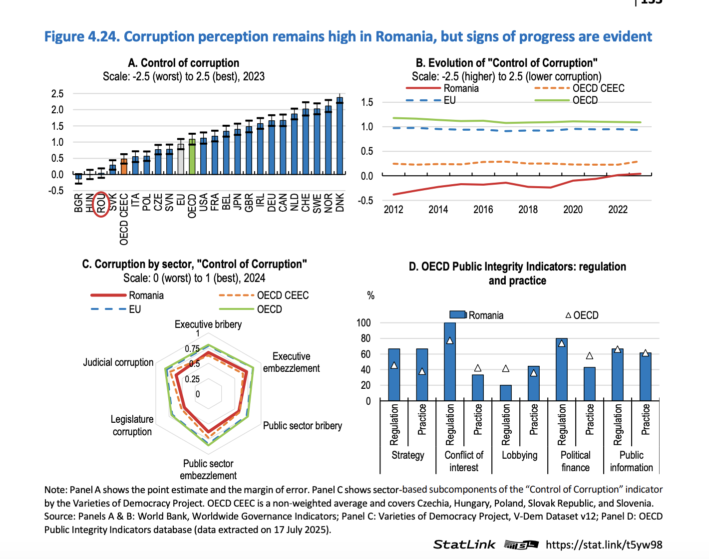 „Dacă nu este controlată, corupția poate duce la cheltuieli publice risipitoare sau ineficiente, la un mediu de afaceri necompetitiv și la elaborarea de politici ineficiente. Percepțiile privind corupția rămân ridicate în România, 75% dintre respondenții la un sondaj Eurobarometru din 2025 considerând-o „răspândită” puțin peste media UE. În timp ce puțini declară că au fost martori sau au experimentat personal corupția, 60% au declarat că sunt afectați personal de corupție în viața de zi cu zi. Acest lucru sugerează că în România, ca și în alte țări, corupția a devenit mai complexă decât noțiunea tradițională de jefuire cotidiană”, arată raportul OCDE.
