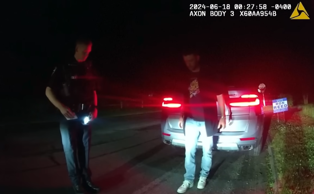 El refuză să facă testul cu etilotestul și se împiedică de câteva ori când i se cere să meargă cu vârful piciorului stâng în călcâiul dreptului. El le spune ofițerilor că este „puțin nervos”.