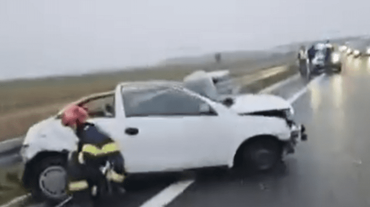Imaginile apărute în mediul online arată un autoturism grav avariat, în timp ce echipajele de intervenție acționează pentru înlăturarea efectelor accidentului.