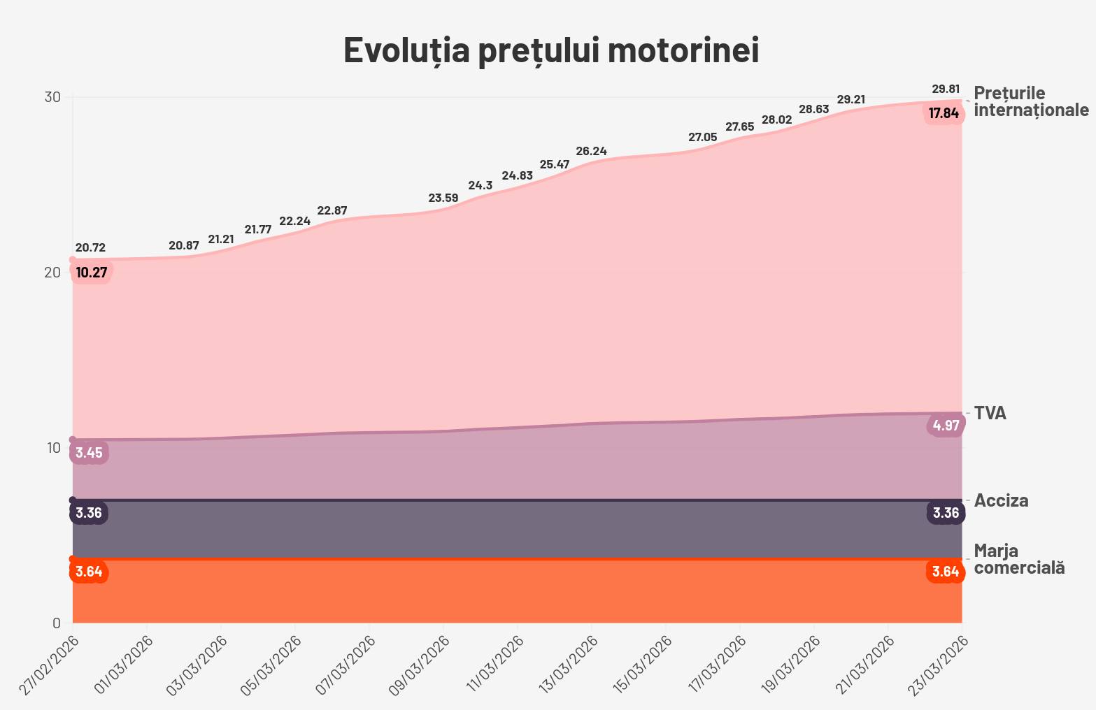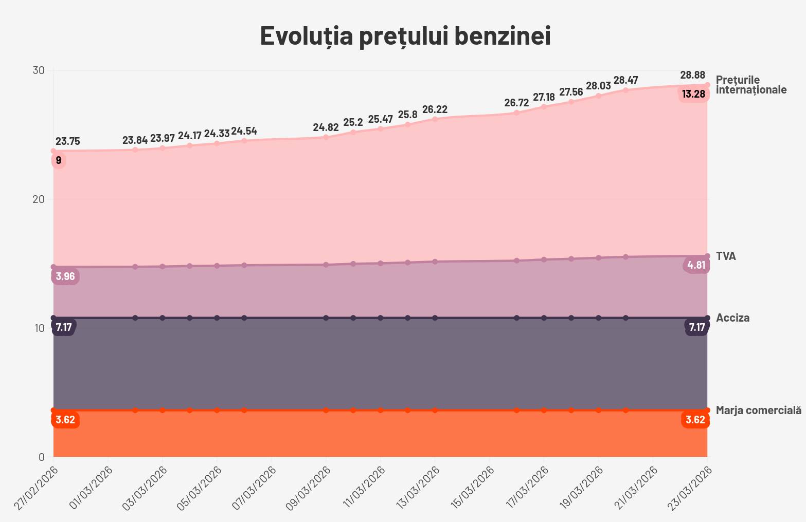 | Motorină | aproximativ 8.33 lei | ~28% |