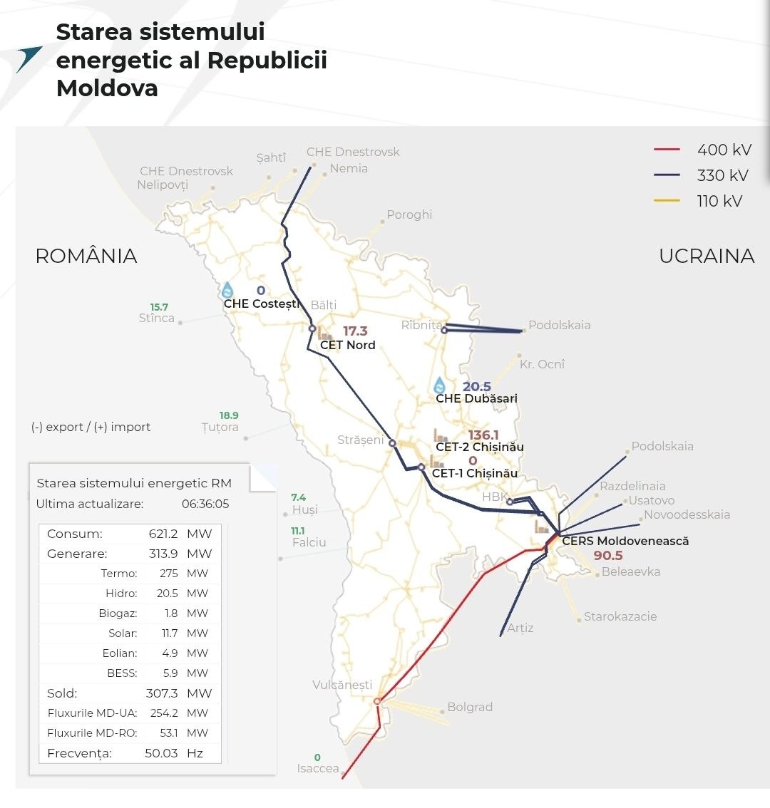 Alimentarea cu energie electrică a Republica Moldova este menținută, după ce, pe parcursul nopții, operatorul sistemului electroenergetic Moldelectrica, în coordonare cu operatorii de transport din România și Ucraina, a pus în funcțiune rute alternative de aprovizionare, anunță Ministerul Energiei.