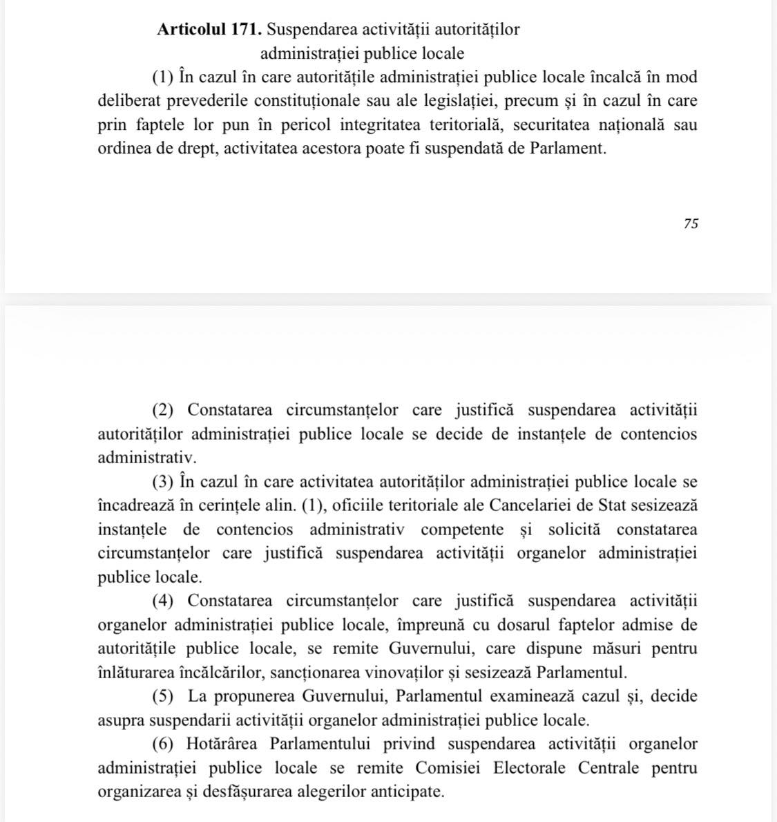 Potrivit comunicatului, prevederea oferă Parlamentului competența de a suspenda activitatea autorităților administrației publice locale, inclusiv în situații în care acestea „încalcă în mod deliberat prevederile constituționale sau ale legislației” ori „pun în pericol integritatea teritorială, securitatea națională sau ordinea de drept”.