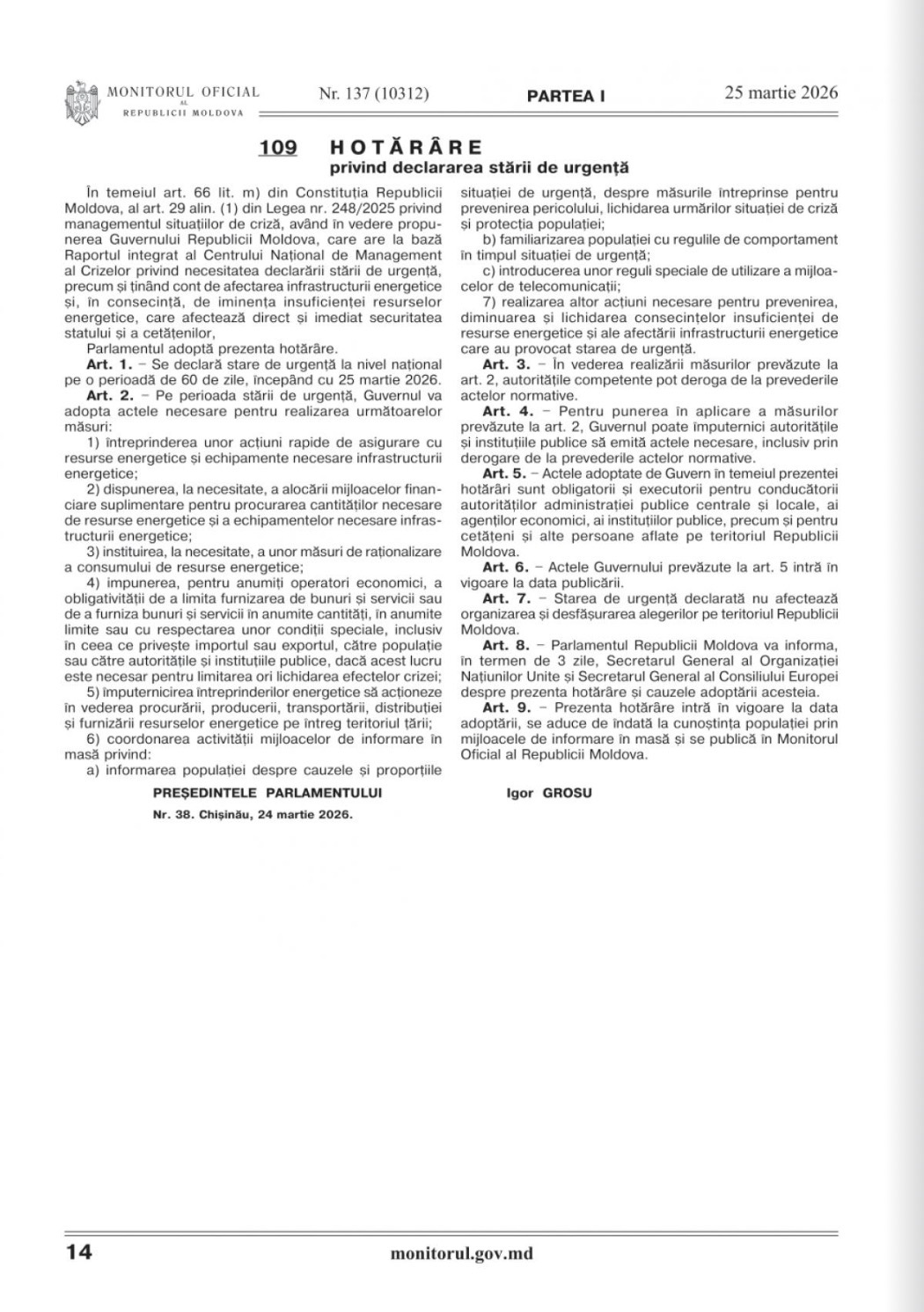 Potrivit documentului, starea de urgență este instituită pe întreg teritoriul țării pentru o perioadă de 60 de zile, începând cu 25 martie 2026.