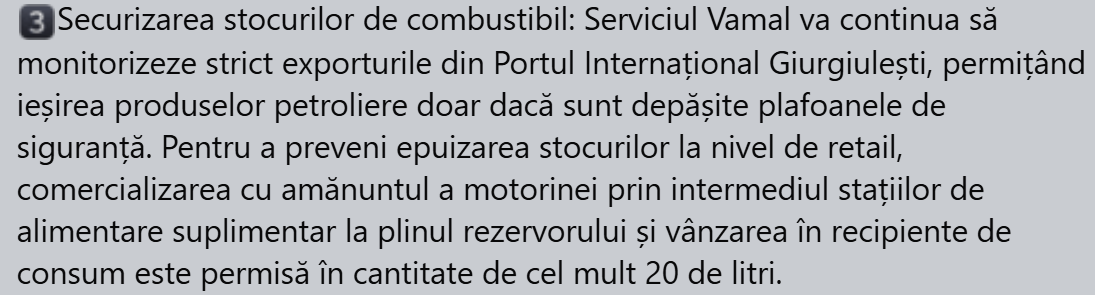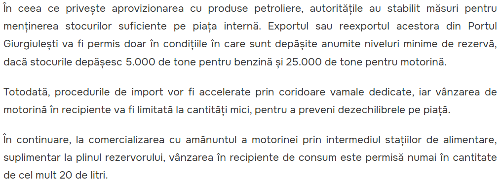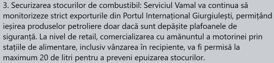 Astfel fiind spuse, rămâne în vigoare doar restricția impusă din 18 martie, cea de a nu permite agenților economici din retail vânzarea a mai mult de 20 de litri de motorină în recipiente omologate.
