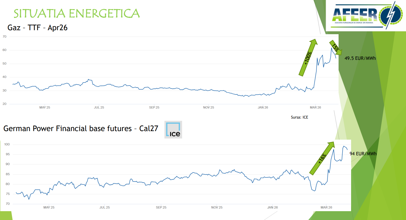 „Singurul lucru care a scăzut în ultimele săptămâni este prețul certificatelor de emisii, avem o scădere cu 31%. Prețul gazului s-a dublat, iar acum avem o scădere de vreo 15%, și pe energie avem o creștere de 16%, toate în urma situație din Golf”, a detaliat președintele AFEER.