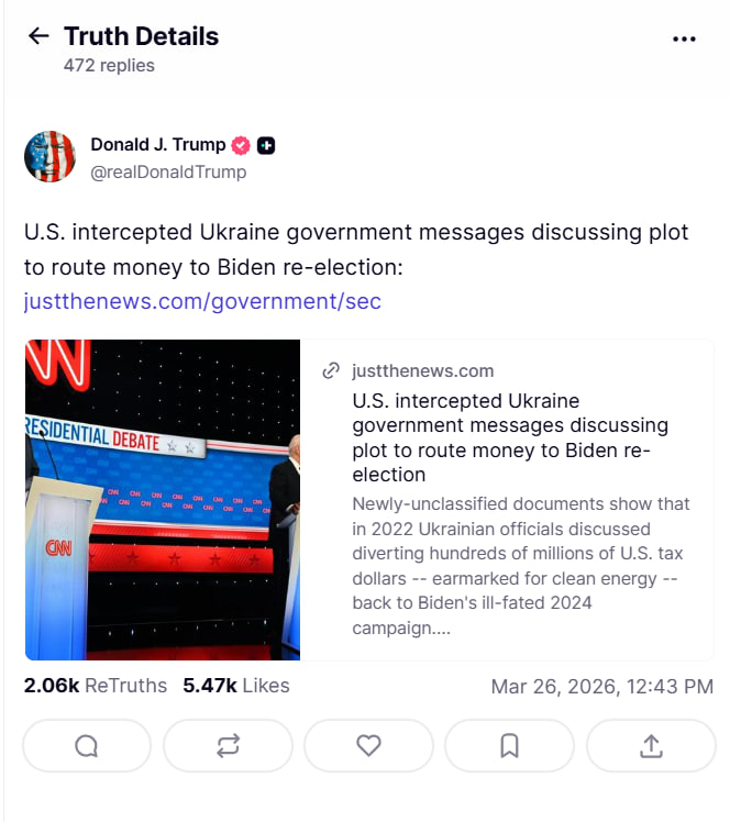 „Statele Unite au interceptat mesaje ale guvernului ucrainean în care era discutat un complot pentru redirecționarea banilor în scopul realegerii lui Biden”, a scris Donald Trump.