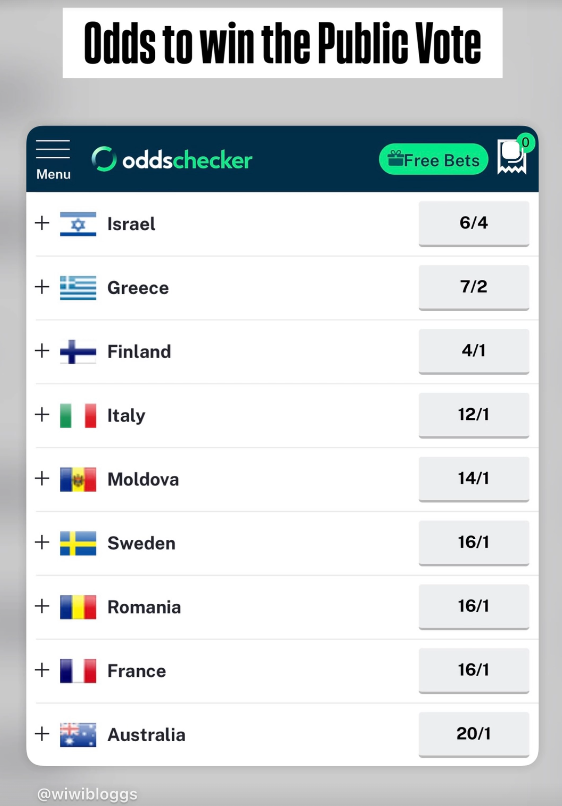 Conform platformei de pariuri Oddschecker, Moldova ocupă locul 5 în topul favoritelor la votul publicului la Eurovision 2026, cu cota 14/1. Înaintea ei se află Israel, marele favorit cu cota 6/4, urmat de Grecia (7/2), Finlanda (4/1) și Italia (12/1). România se află pe poziția a șaptea, cu cota 16/1.