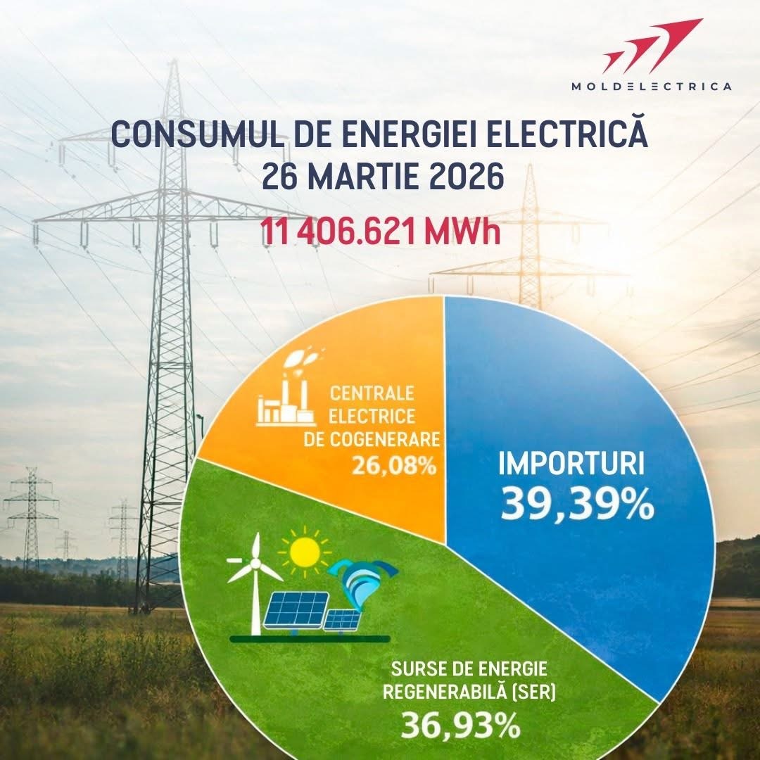 Moldelectrica informează că, în baza datelor operative colectate prin sistemul SCADA, consumul de energie electrică înregistrat pe 26 martie la nivelul Sistemului Electroenergetic Național a constituit 11406,621 MWh, în scădere cu 3% față de ziua precedentă.