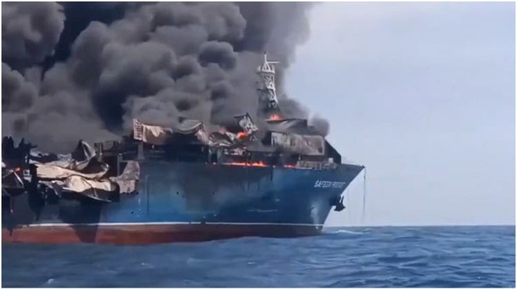 O navă comercială sub pavilion thailandez a fost lovită în timp ce încerca să iasă din Golful Persic, potrivit informațiilor apărute recent. Imaginile surprinse la fața locului arată cum cargoul este cuprins de flăcări, „arzând ca o torță”.