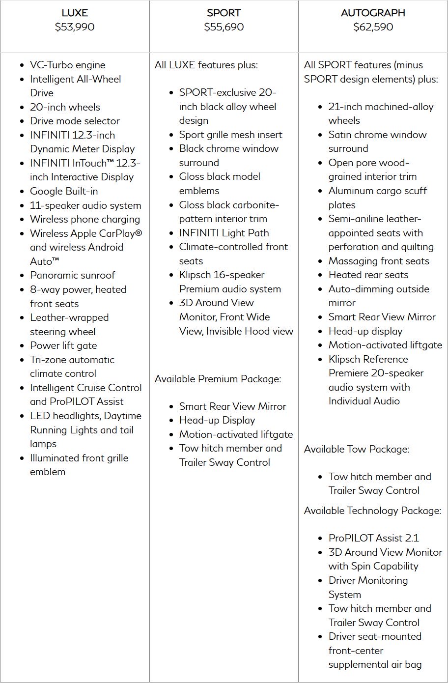 Construit la uzina INFINITI din Smyrna, Tennessee, noul QX65 va ajunge în showroomuri la începutul verii, cu un preț de pornire de 53.990 dolari. Premiera publică va avea loc la New York International Auto Show în aprilie.