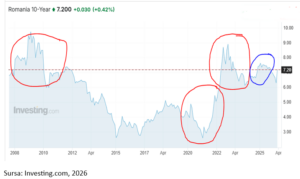 Detaliat, impactul asupra creșterii cheltuielilor cu dobânzile provine din creșterea costurilor de finanțare ale României. Dacă ne uităm la evoluția randamentelor la 10y, vom observa patru salturi importante în costurile de împrumut ale României, salturi structurale de altfel, și nu temporare. Deci cu efecte persistente.
