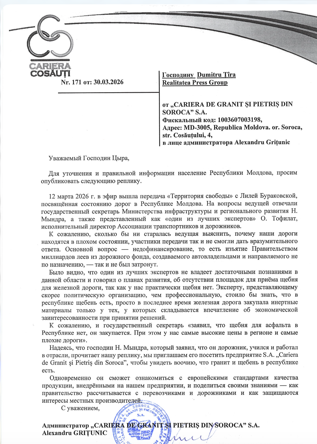 În speranța că domnul N. Mindra, care a susținut că este constructor de drumuri, a studiat și lucrat în domeniu, va citi observația noastră, îl invităm să viziteze compania S. A. „Cariera de granit și pietriș din Soroca”, pentru a vedea că avem granit și pietriș în Republică”, se arată în replica întreprinderii.