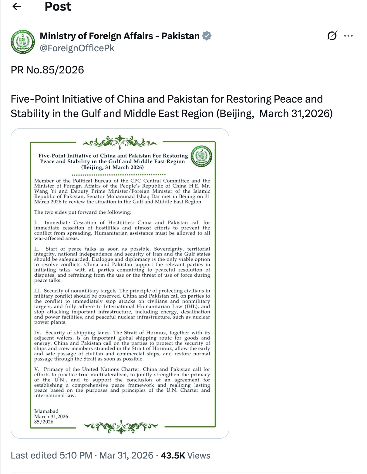 China și Pakistanul susțin că inițiativa planului de pace în cinci puncte vizează „restabilirea păcii și stabilității în regiunea Golfului și a Orientului Mijlociu”.