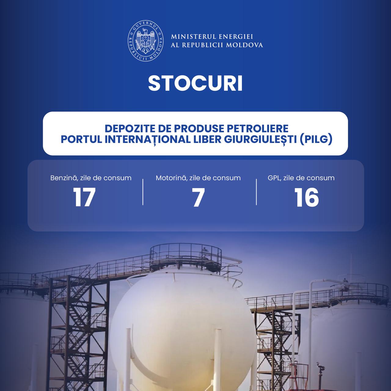Potrivit instituției, la aceeași dată, stocurile de carburanți constituiau 17 zile de consum pentru benzină, 16 zile pentru gazele petroliere lichefiate și 7 zile de consum pentru motorină.
