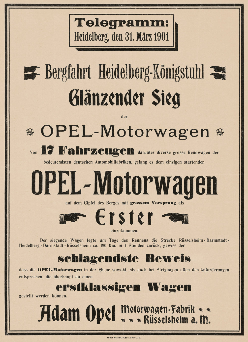 Momentul mult așteptat a sosit pe 31 martie 1901. Heinrich Opel s-a aliniat la startul primei curse de „drum montan” de pe Königstuhl, la volanul unui Motorwagen modificat. Cursa organizată de Rheinischer Automobilclub în apropiere de Heidelberg a fost probabil prima din regiunea Rin-Neckar și una dintre primele curse de tip hill climb din Germania.