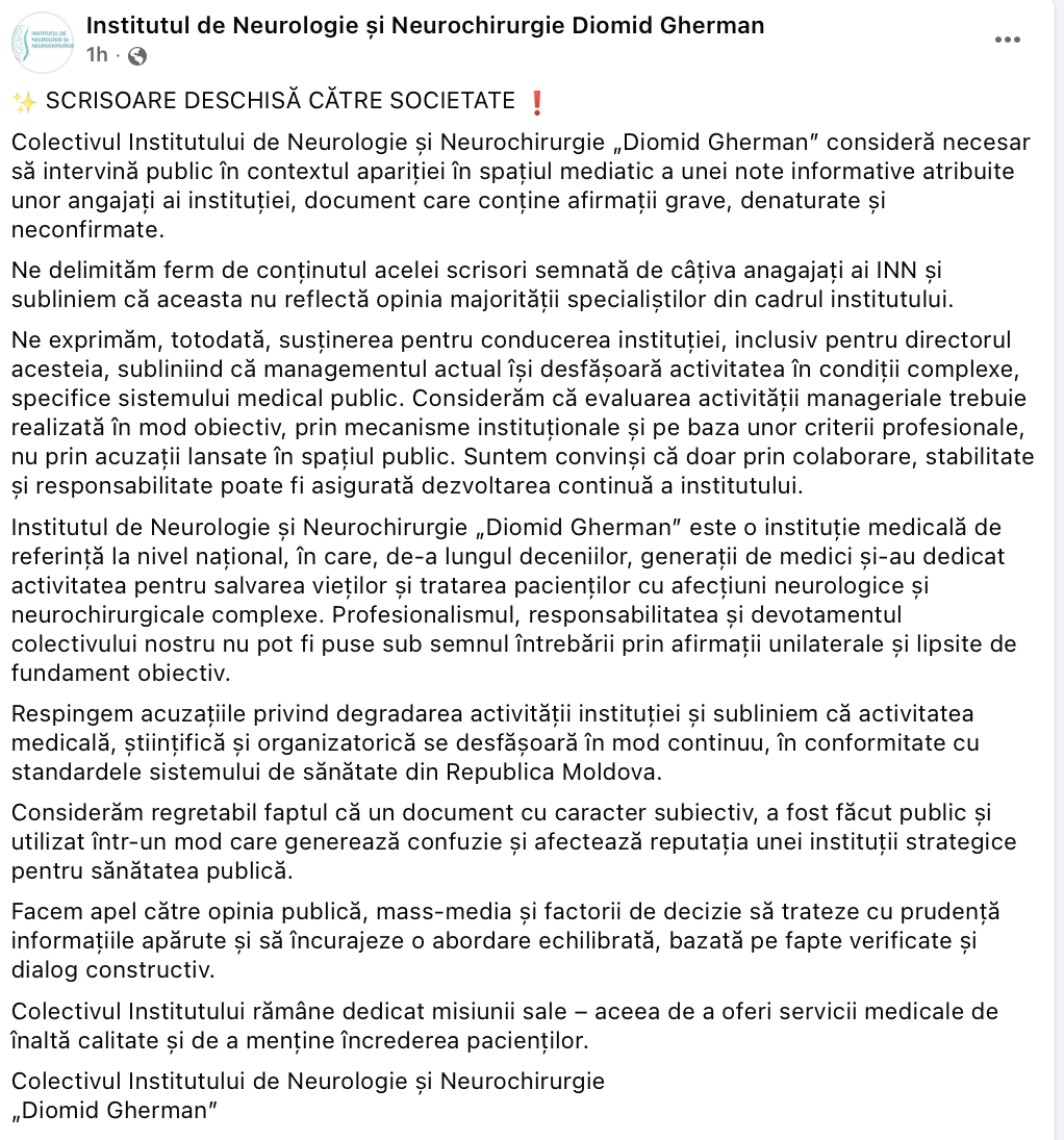 Institutul de Neurologie și Neurochirurgie „Diomid Gherman” este o instituție medicală de referință la nivel național, în care, de-a lungul deceniilor, generații de medici și-au dedicat activitatea pentru salvarea vieților și tratarea pacienților cu afecțiuni neurologice și neurochirurgicale complexe. Profesionalismul, responsabilitatea și devotamentul colectivului nostru nu pot fi puse sub semnul întrebării prin afirmații unilaterale și lipsite de fundament obiectiv.