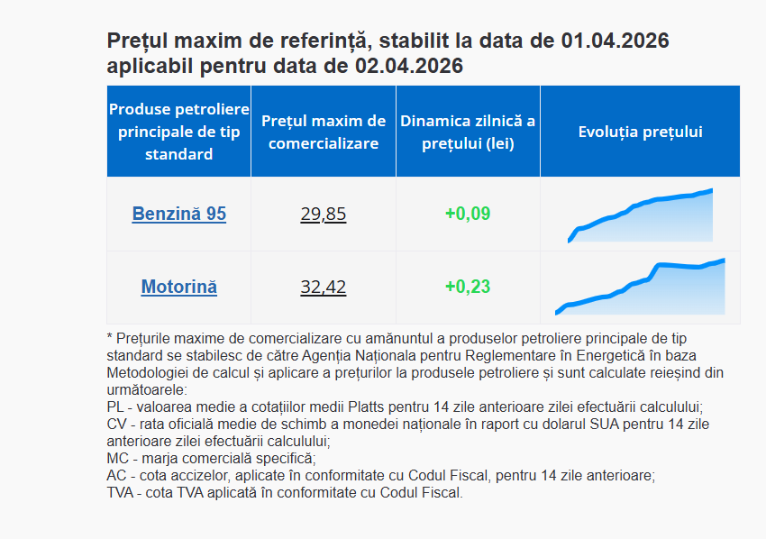 Pentru un litru de benzină 95, șoferii vor achita 29,85 de lei, iar pentru unul de motorină – 32,42 de lei.