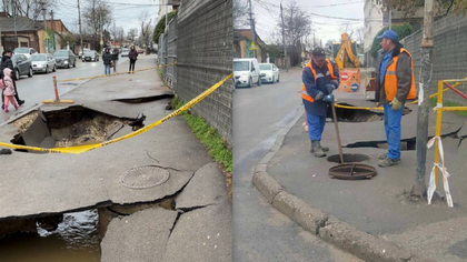 O gaură uriașă a apărut pe trotuarul de pe strada Avram Iancu. Zona a fost delimitată, iar la fața locului au intervenit muncitorii.