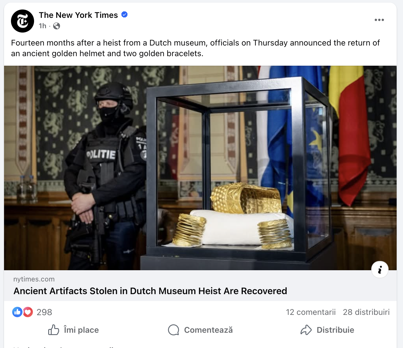 La 14 luni după jaful dintr-un muzeu olandez, oficialii au anunțat joi returnarea unei căști antice de aur și a două brățări de aur.