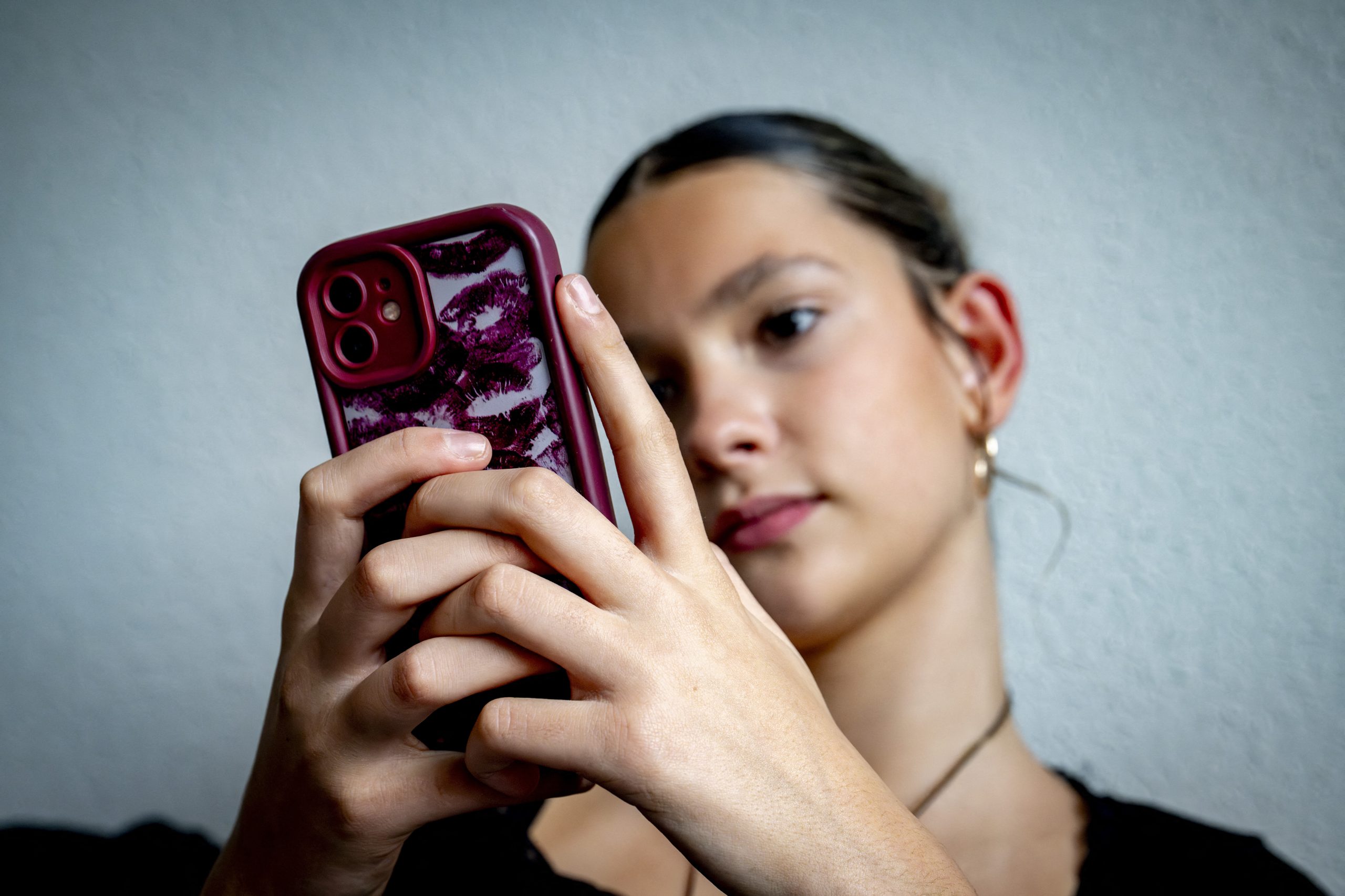 Illustration – A teenage girl on her mobile phone. Maastricht University study found that 70% of young people under 21 are addicted to their mobile phones. More than 1,400 doctors, scientists, and experts are calling on politicians to establish age limits for smartphone and social media use, on October 5, 2025. Photo by Robin Utrecht/BACAPRESS.COM