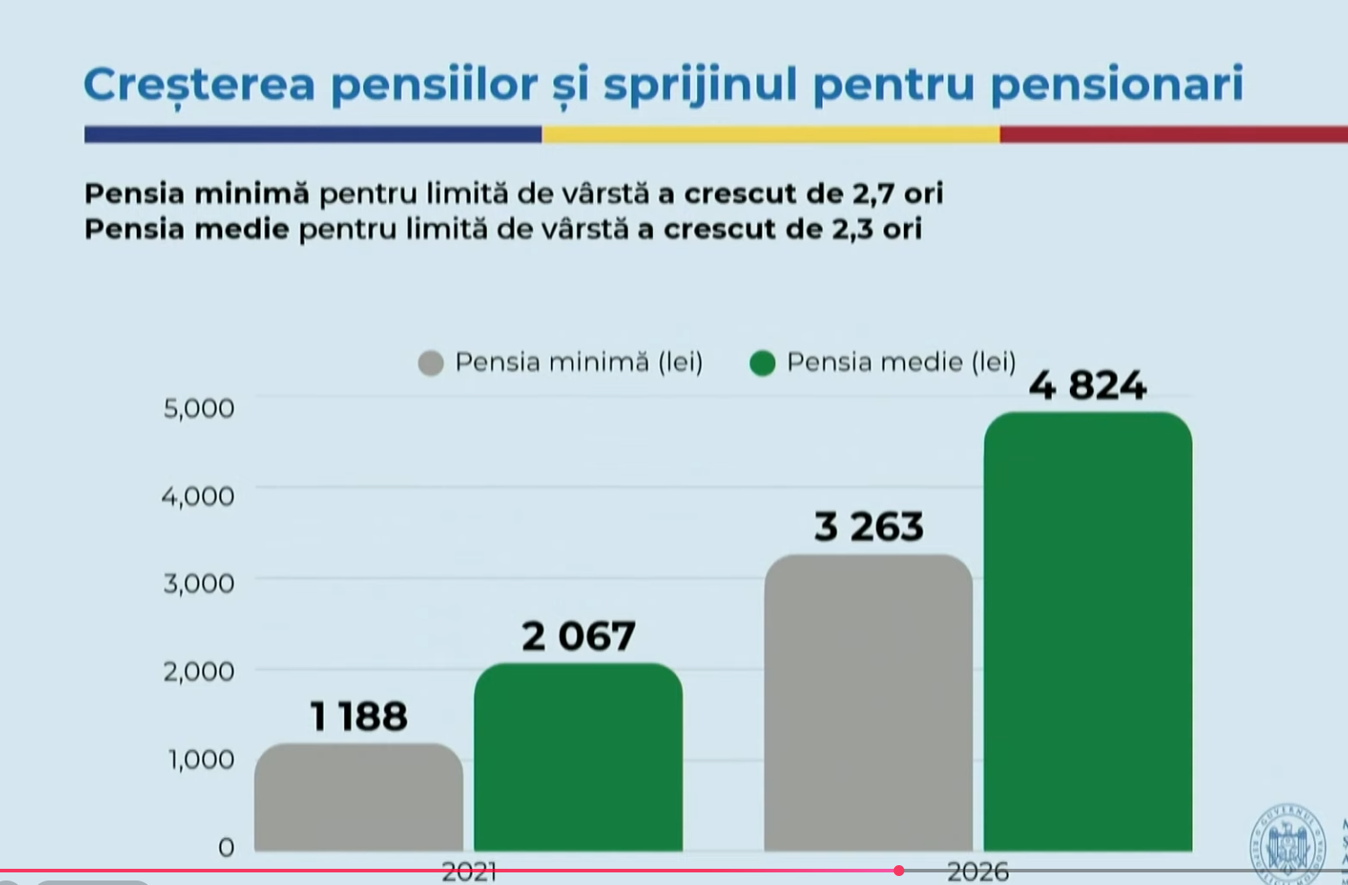 Pensia minimă a crescut de la 1.188 lei în 2021 la 3.263 lei în 2026 (de 2,7 ori), în timp ce pensia medie a crescut de la 2.067 lei la 4.824 lei (de 2,3 ori).