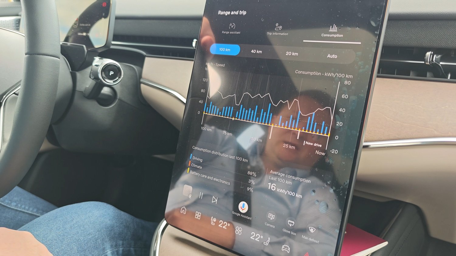 Bateria montată pe versiunea Single Motor testată are o capacitate de 92 kWh, iar consumul mediu de energie înregistrat pe parcursul testului a fost de 15 kWh la 100 de kilometri, sub valoarea preliminară declarată de producător la momentul prezentării de acum un an (16.1 kWh/100 km). Acest consum redus permite o autonomie reală de peste 500 de kilometri în condiții mixte de rulare. În regim de autostradă, la viteze de aproximativ 90-100 km/h, consumul s-a ridicat la 16 kWh/100 km.