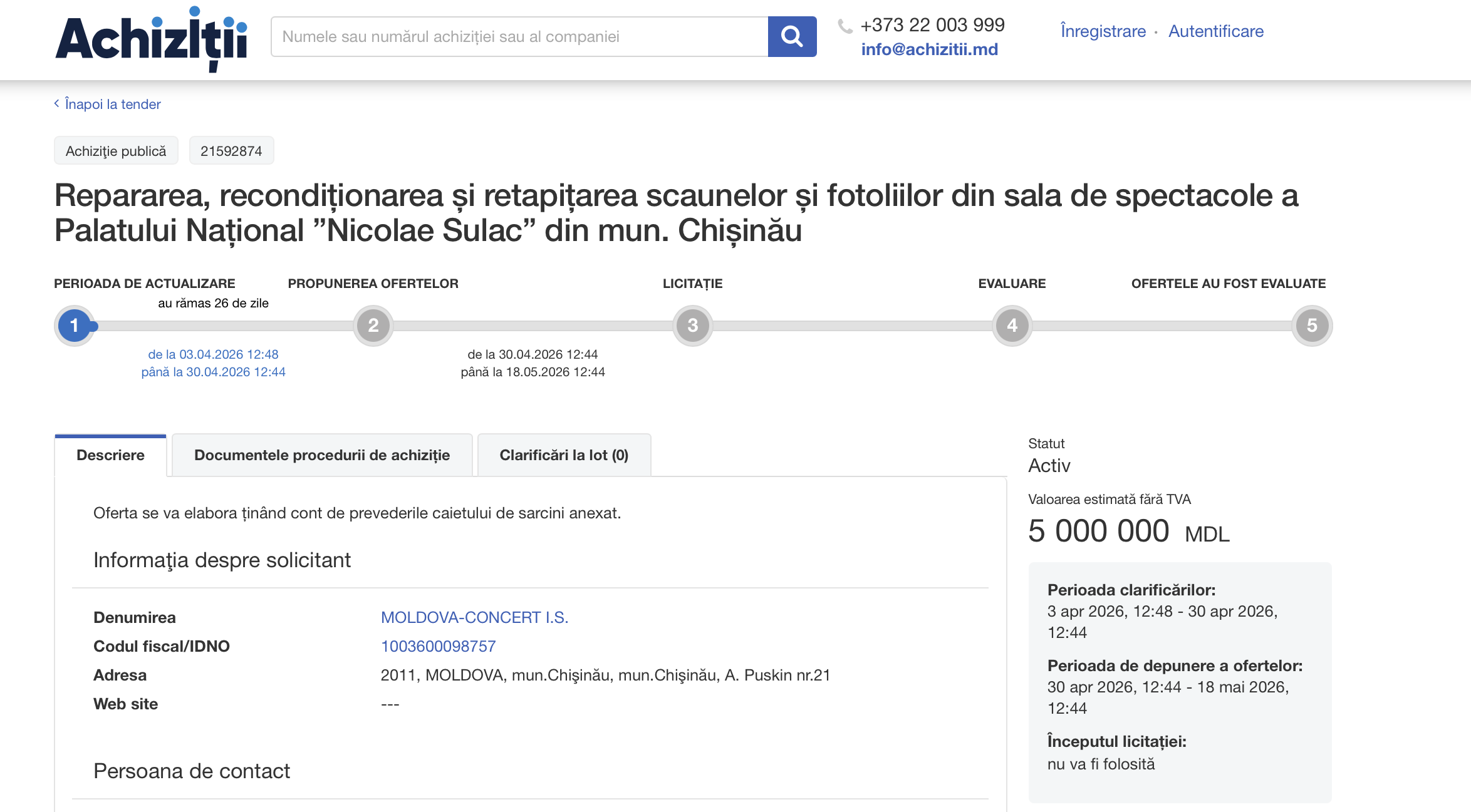 Întreprinderea de Stat „Moldova Concert” planifică cheltuieli de cinci milioane de lei pentru renovarea scaunelor de la Palatul Național „Nicolae Sulac”. Mai exact, este vorba despre schimbarea tapițeriei.
