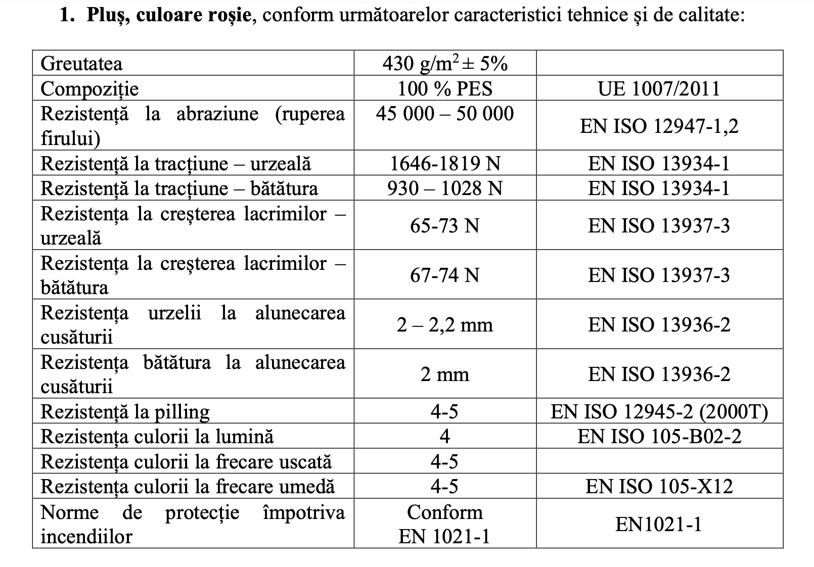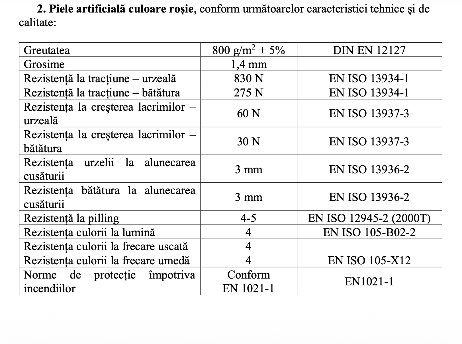 „Buretele utilizat va fi de culoare albă. Toate celelalte materiale și piese de schimb necesare pentru repararea și retapițarea scaunelor vor fi asigurate de către Prestator, pe cheltuiala acestuia. De asemenea, echipamentele de croit și orice alte piese de schimb necesare execuției lucrărilor cad în sarcina prestatorului”, se mai arată în document.