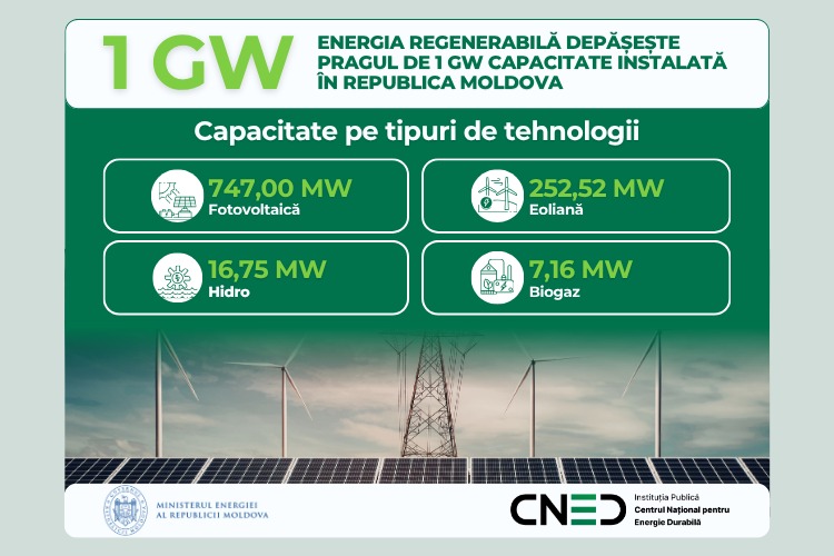 Republica Moldova a depășit un prag istoric în tranziția sa energetică. Capacitatea totală instalată din surse de energie regenerabilă (SER) a atins 1023,42 MW, depășind pragul de 1 GW. Anunțul a fost făcut astăzi de Centrul Național pentru Energie Durabilă (CNED), instituția responsabilă cu coordonarea și implementarea politicilor de stat în domeniul energiei regenerabile.