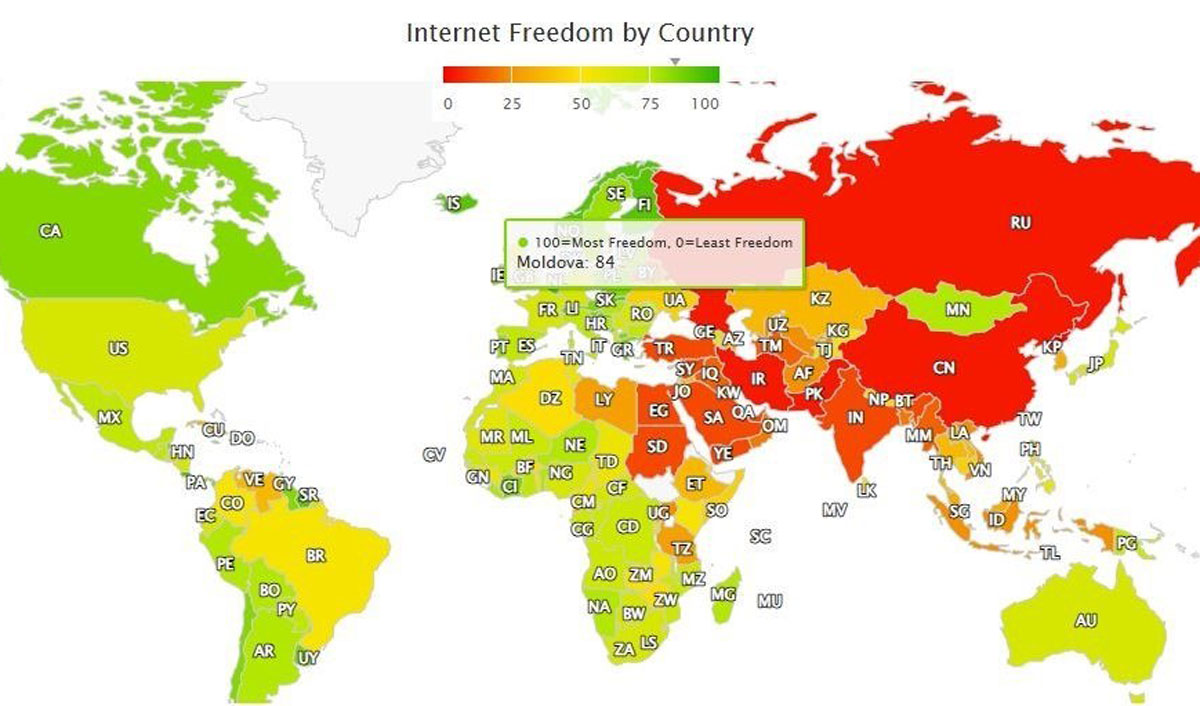 Moldova a ajuns în următorul grup de țări, care a obținut 84 de puncte. Nivelul de libertate a internetului în Moldova este evaluat la același nivel ca în alte 26 de țări, printre care se remarcă Elveția, Austria, Grecia, Canada, Slovenia, Croația, Muntenegru și Chile.
