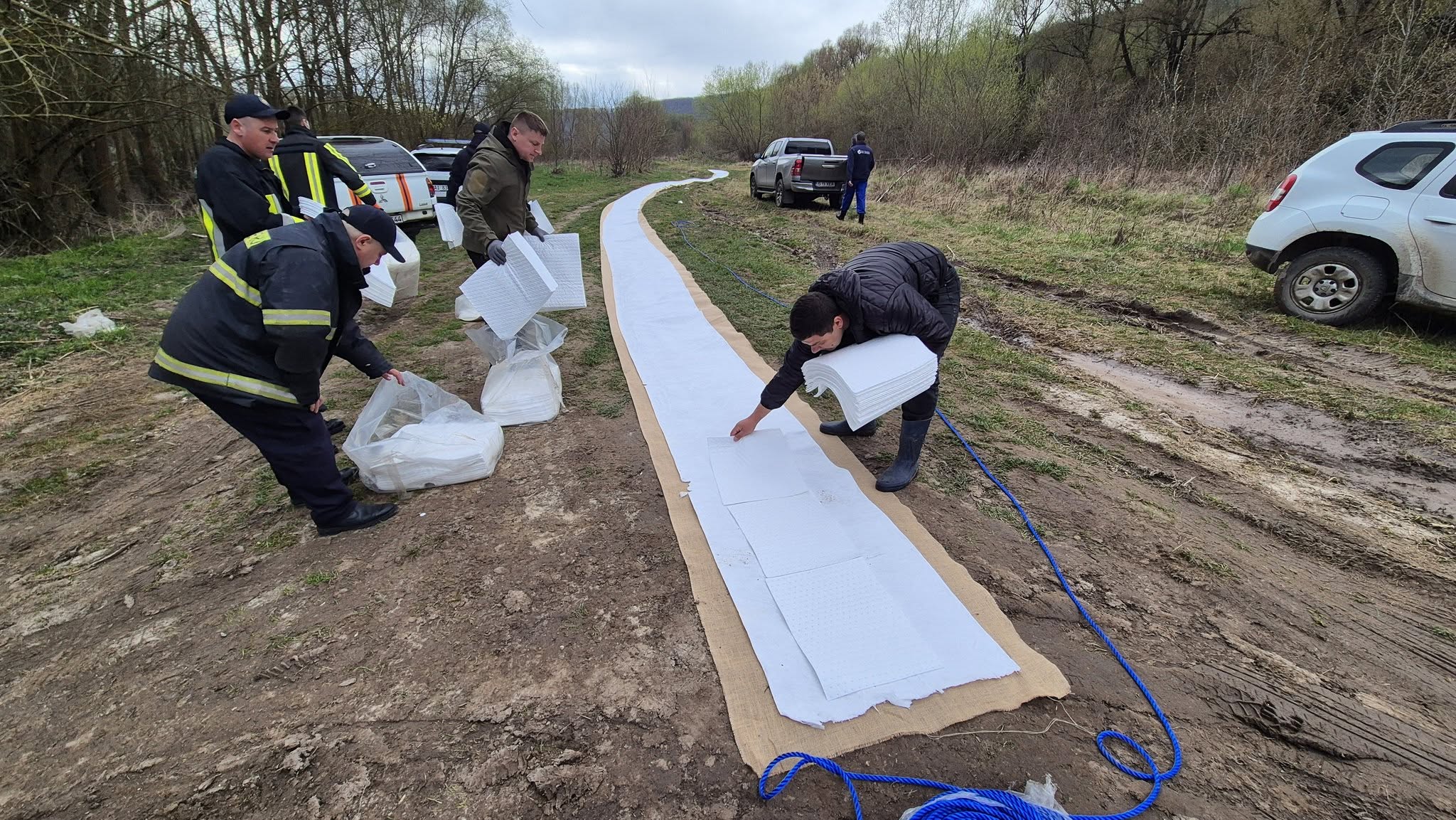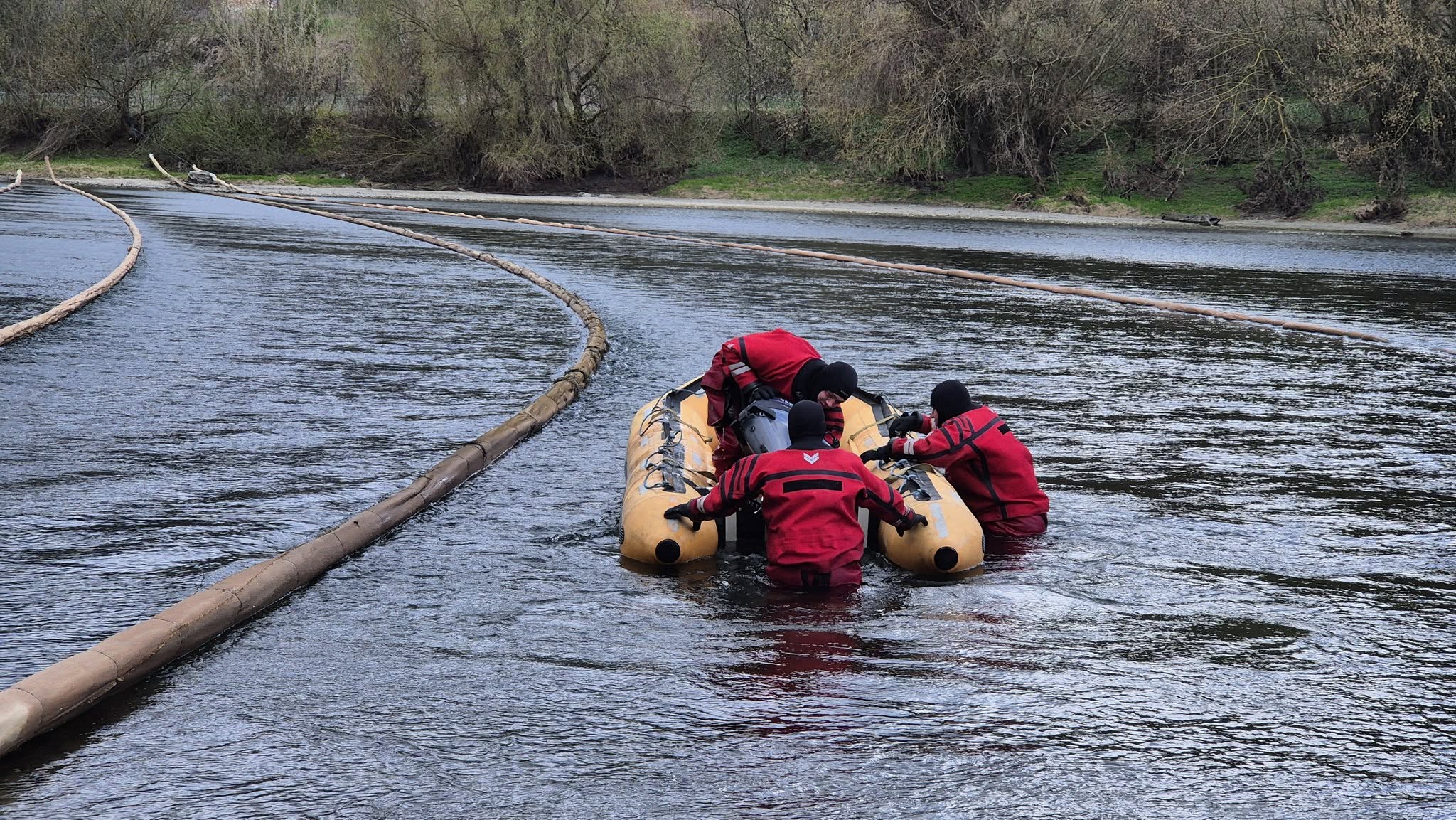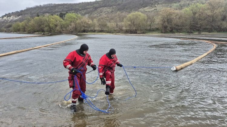 În paralel, echipele de intervenție dispersează material absorbant în amonte de mai multe ori pe zi, iar suplimentar, direct peste baraje, este aplicată o soluție diluată specială destinată dizolvării substanțelor petroliere.