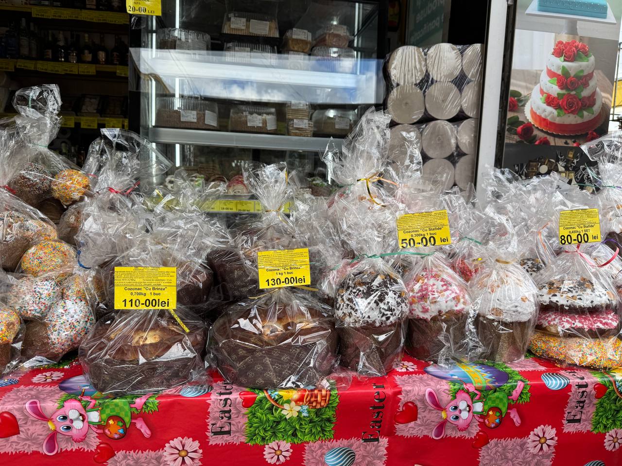Cozonaci sunt de diferite dimensiuni și producători, iar prețul pornește de la 25 de lei și ajunge la 130 lei. Astfel, prețul unui coș cu principalele produse de Paște ajunge la 800 de lei.