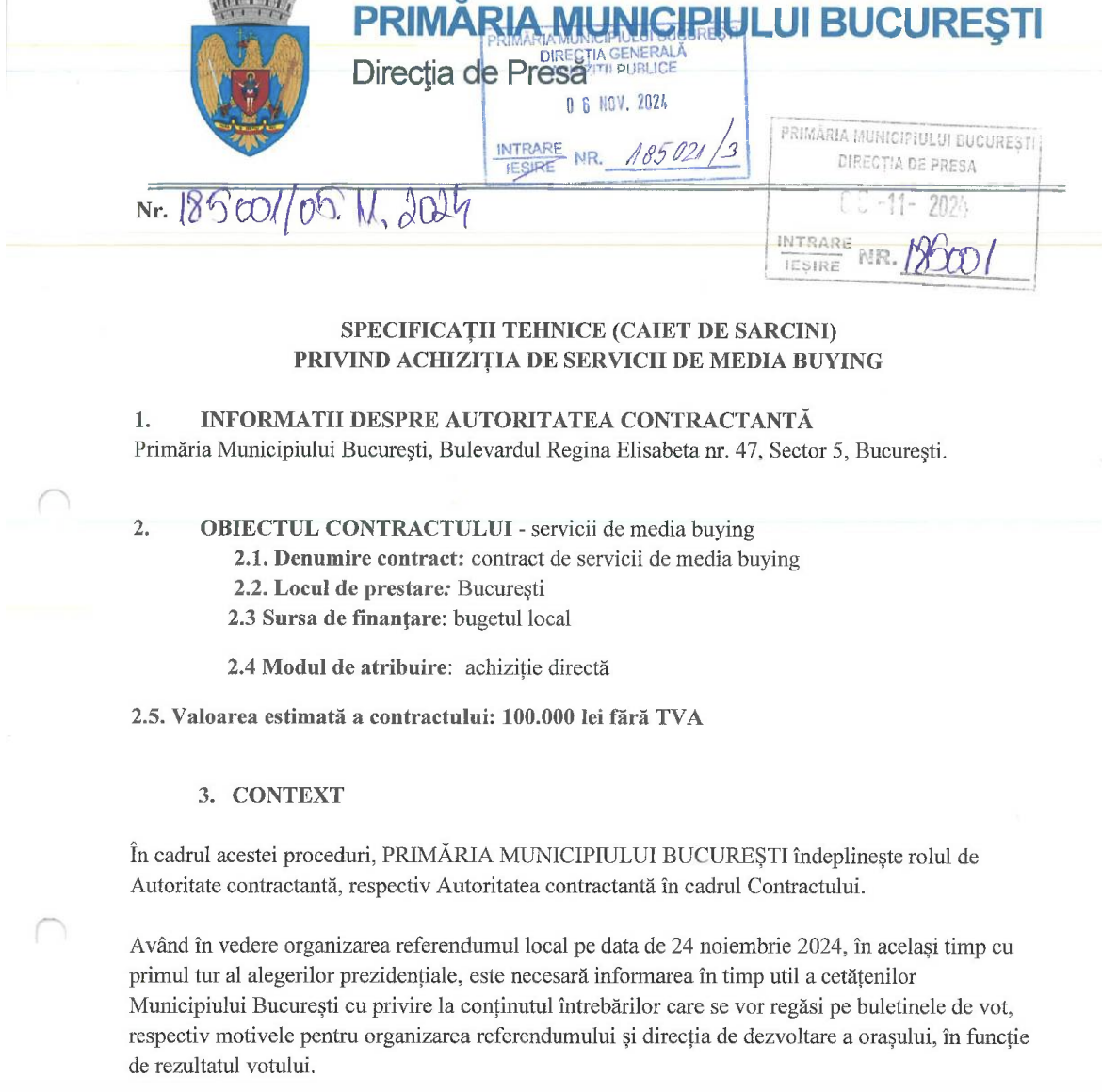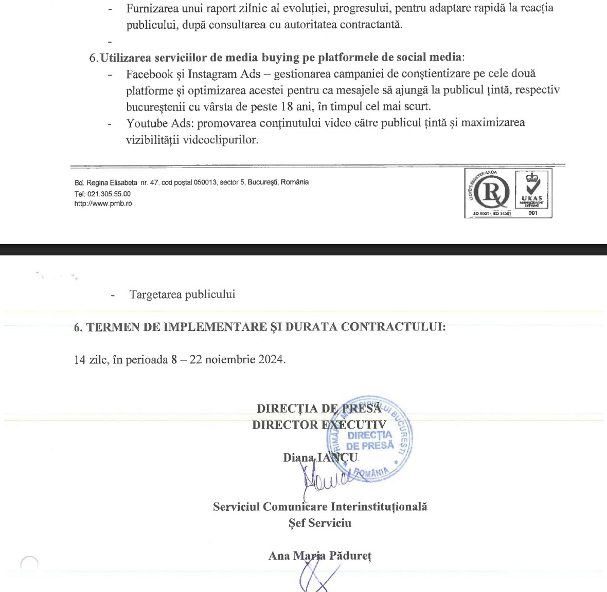 Așa se face că, Diana Iancu/ fostă Lazăr, în calitate de șef al Direcției Presă/ Director Executiv semnează pe 5 noiembrie 2024 caietul de sarcini din partea Primăriei București pentru un contract de „media buying”, cu sursă de finanțare din bugetul local, pentru 100.000 de lei fără TVA.