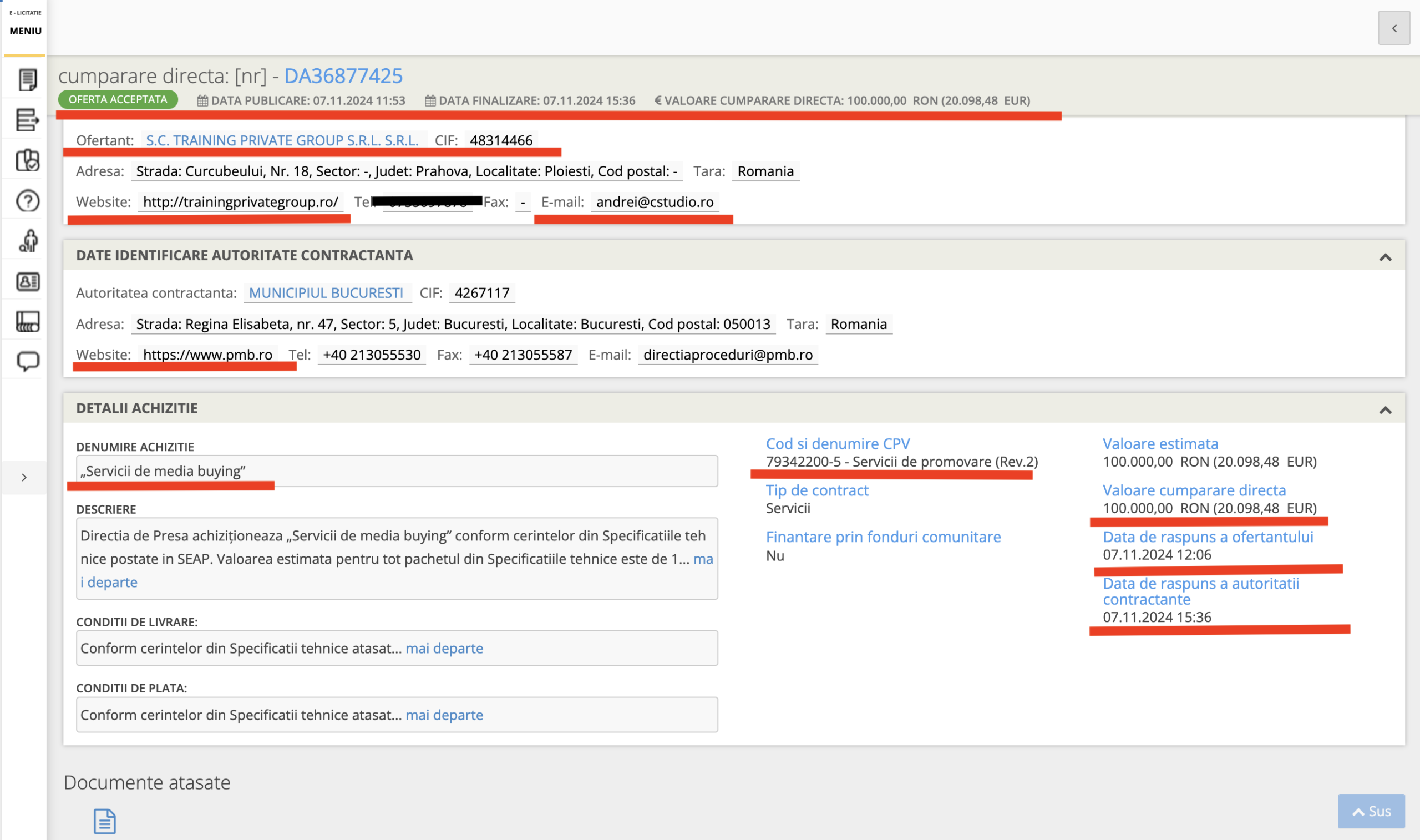 Datele SEAP arată că ofertantul, adică firma lui Andrei Bicuți ( SC Training Private Group SRL) răspunde ofertei pe 7 noiembrie 2024, la ora 12.06 iar totul este acceptat de Primărie în doar 3 ore și jumătate.